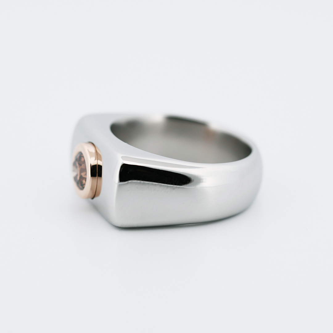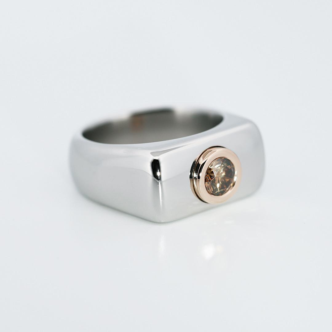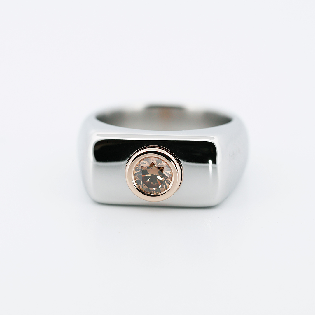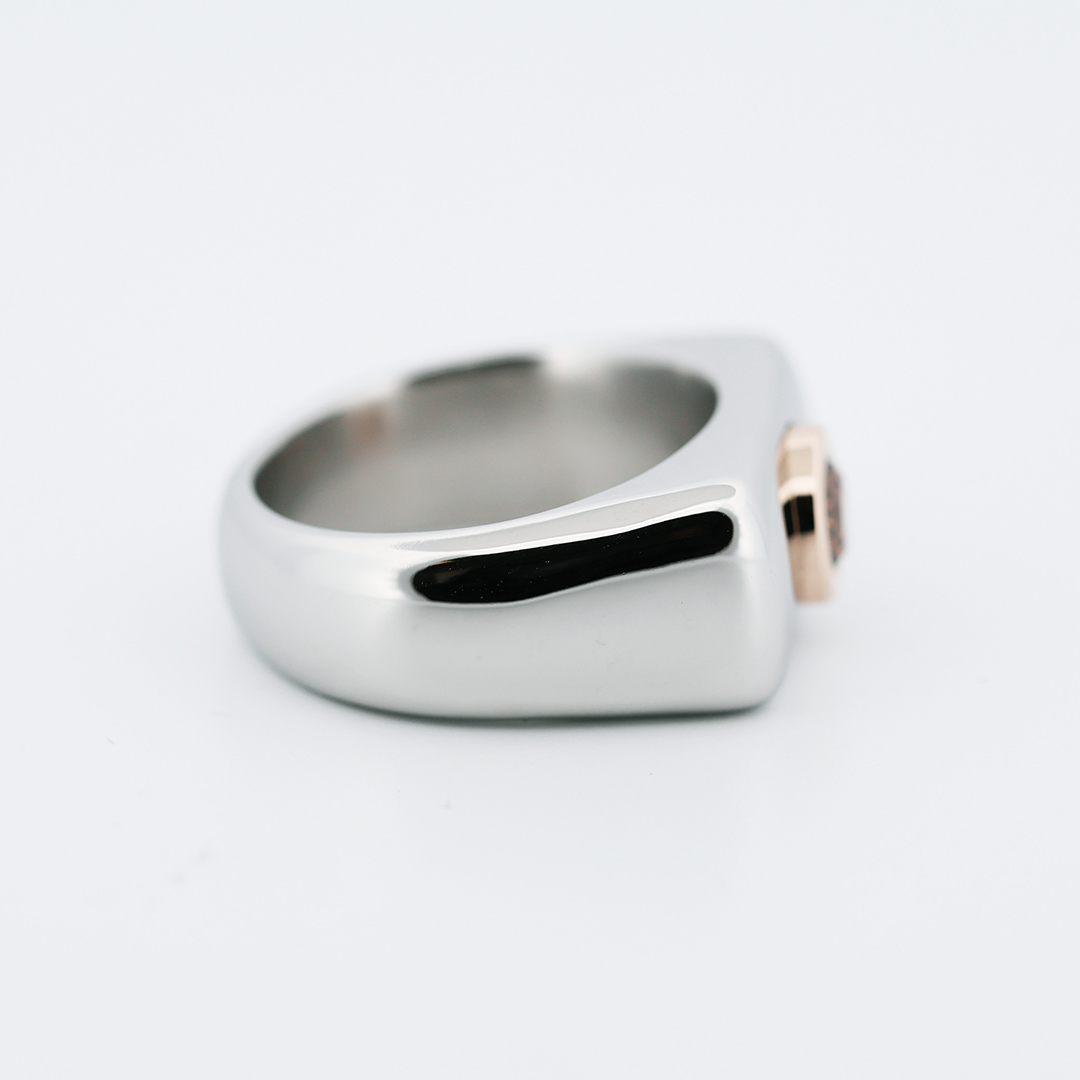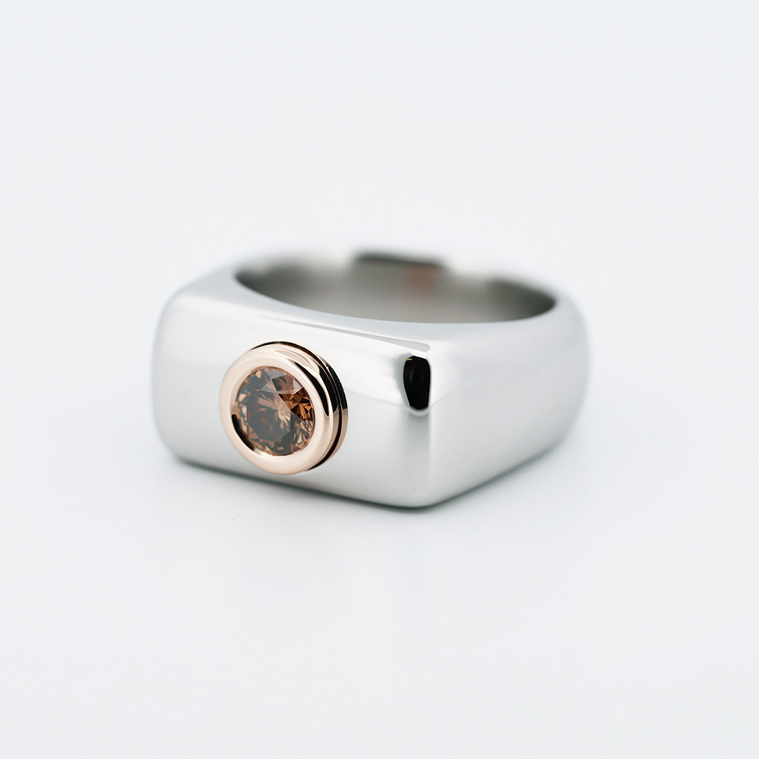 Crafted in aerospace-grade Stellite, the wide architectural band offers exceptional durability while maintaining a sleek polished finish. At its center, an IGI certified natural 0.65 carat Fancy intense orangy brown brilliant -cut diamond is secured in 18K rose gold, creating a powerful contrast between industrial coolness and warm luxury.