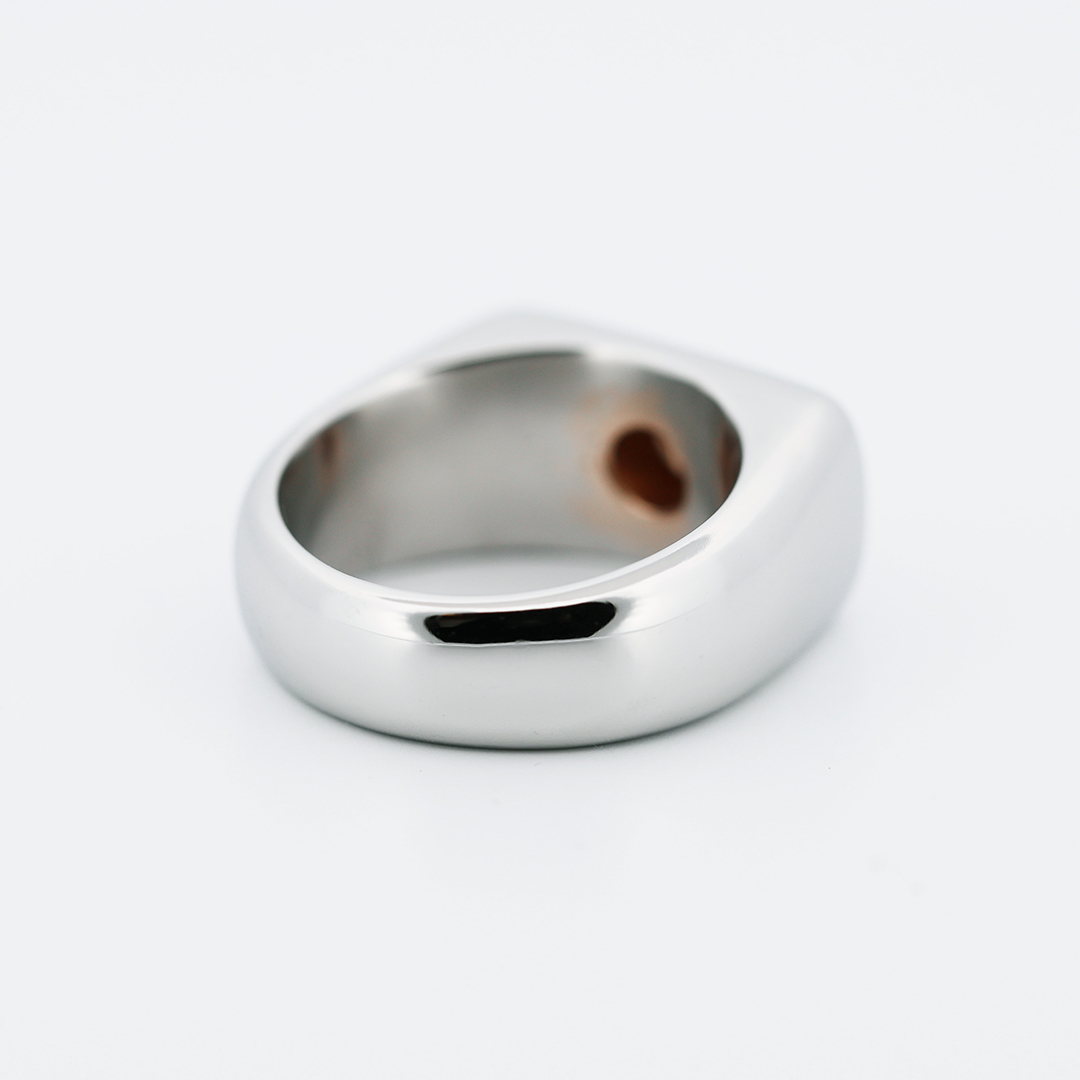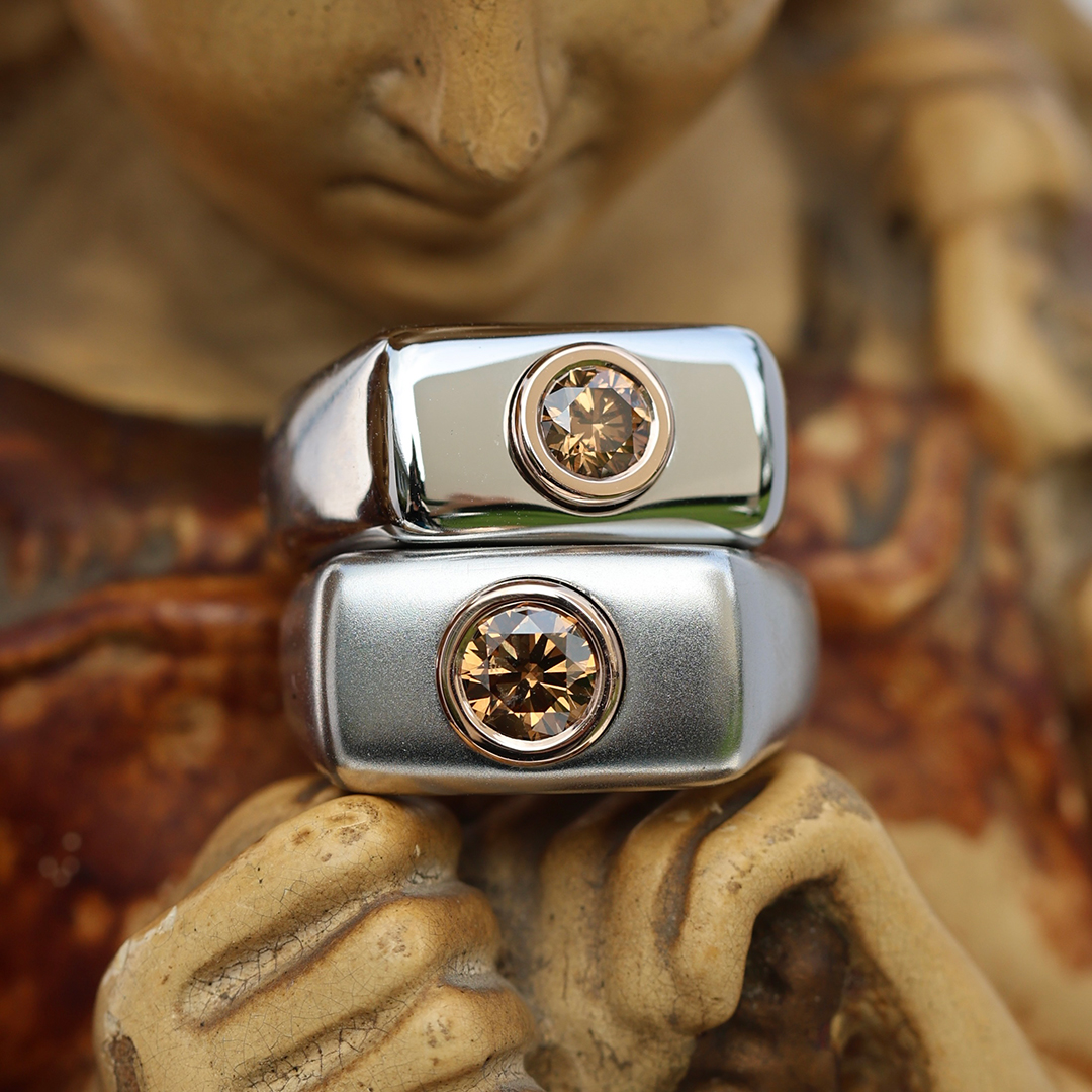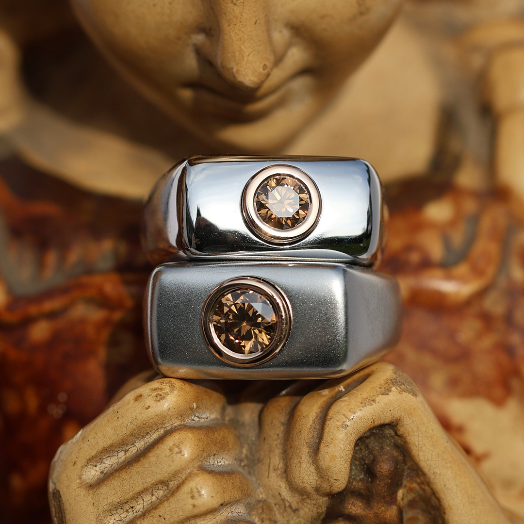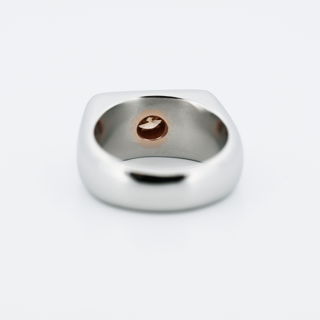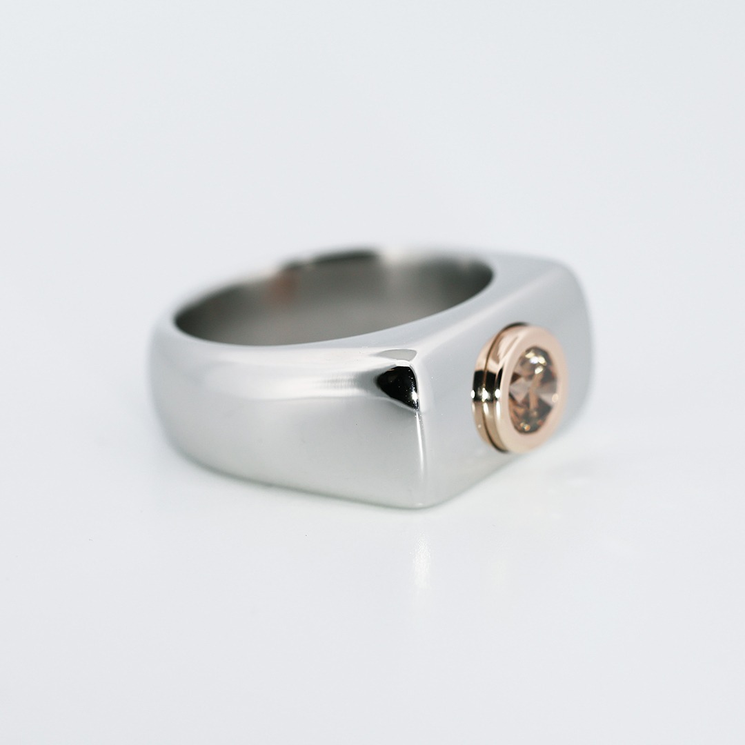 Crafted in aerospace-grade Stellite, the wide architectural band offers exceptional durability while maintaining a sleek polished finish. At its center, an IGI certified natural 0.65 carat Fancy intense orangy brown brilliant -cut diamond is secured in 18K rose gold, creating a powerful contrast between industrial coolness and warm luxury.