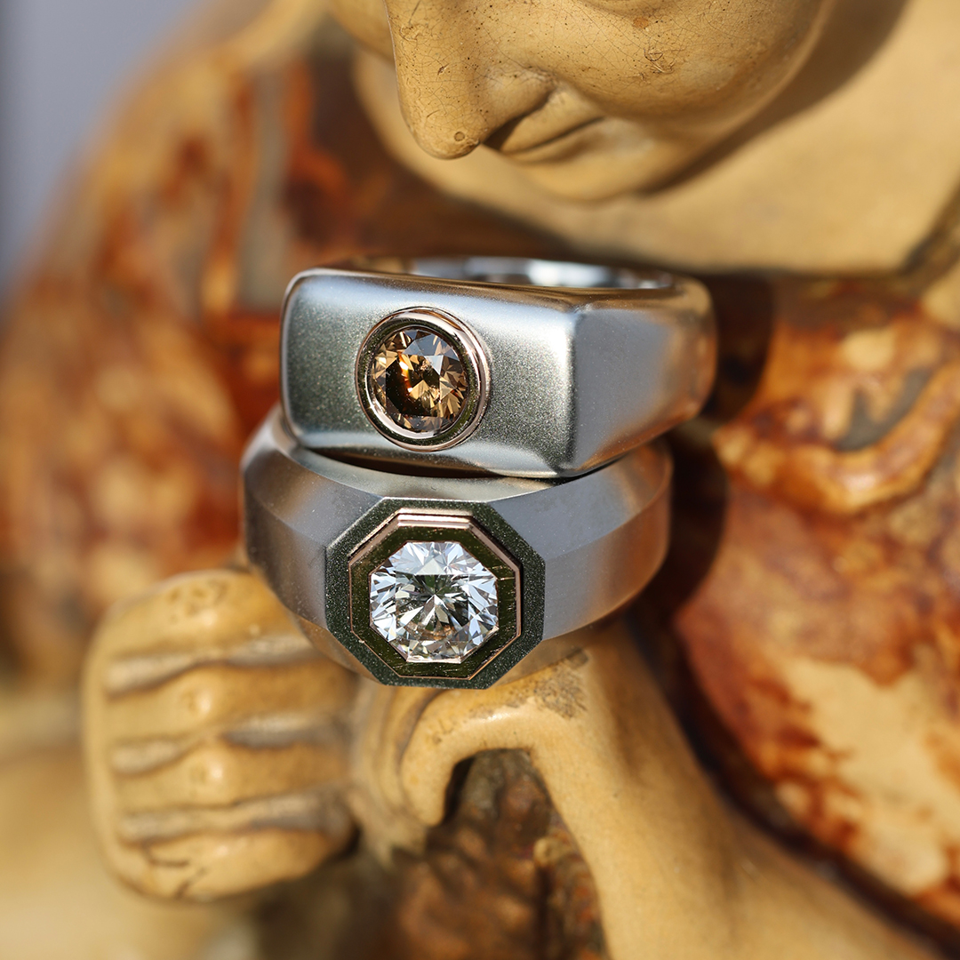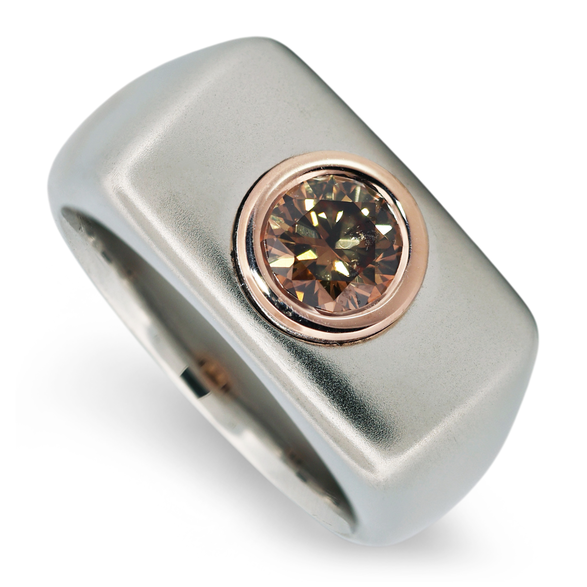 Crafted in aerospace-grade Stellite, the wide architectural band offers exceptional durability. At its center, an IGI certified natural 1.02 carat Fancy intense orangy brown brilliant -cut diamond is secured in 18K rose gold, creating a powerful contrast between industrial coolness and warm luxury.
