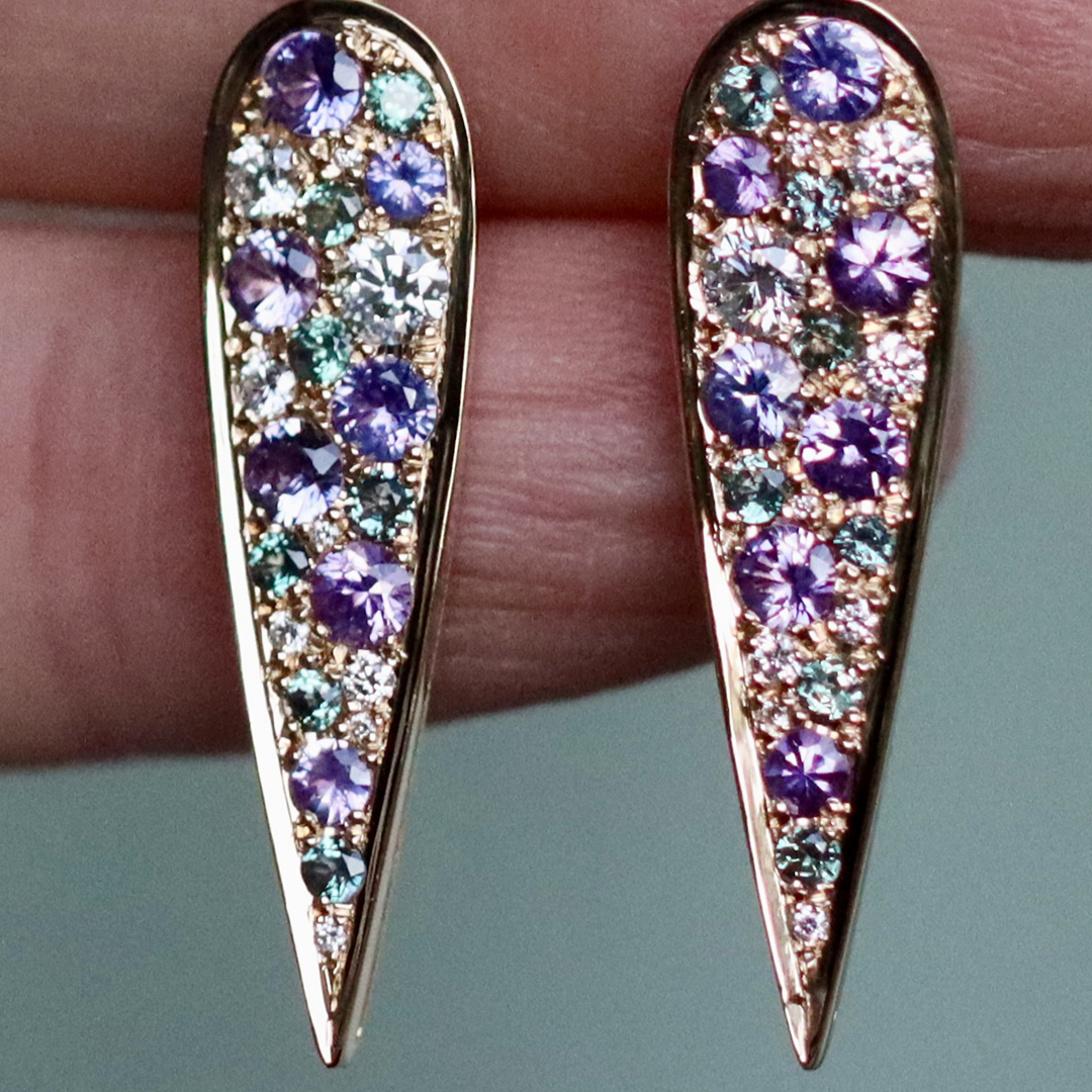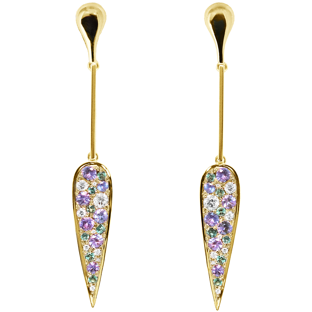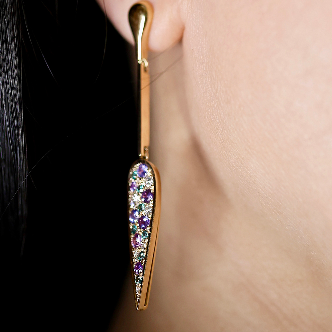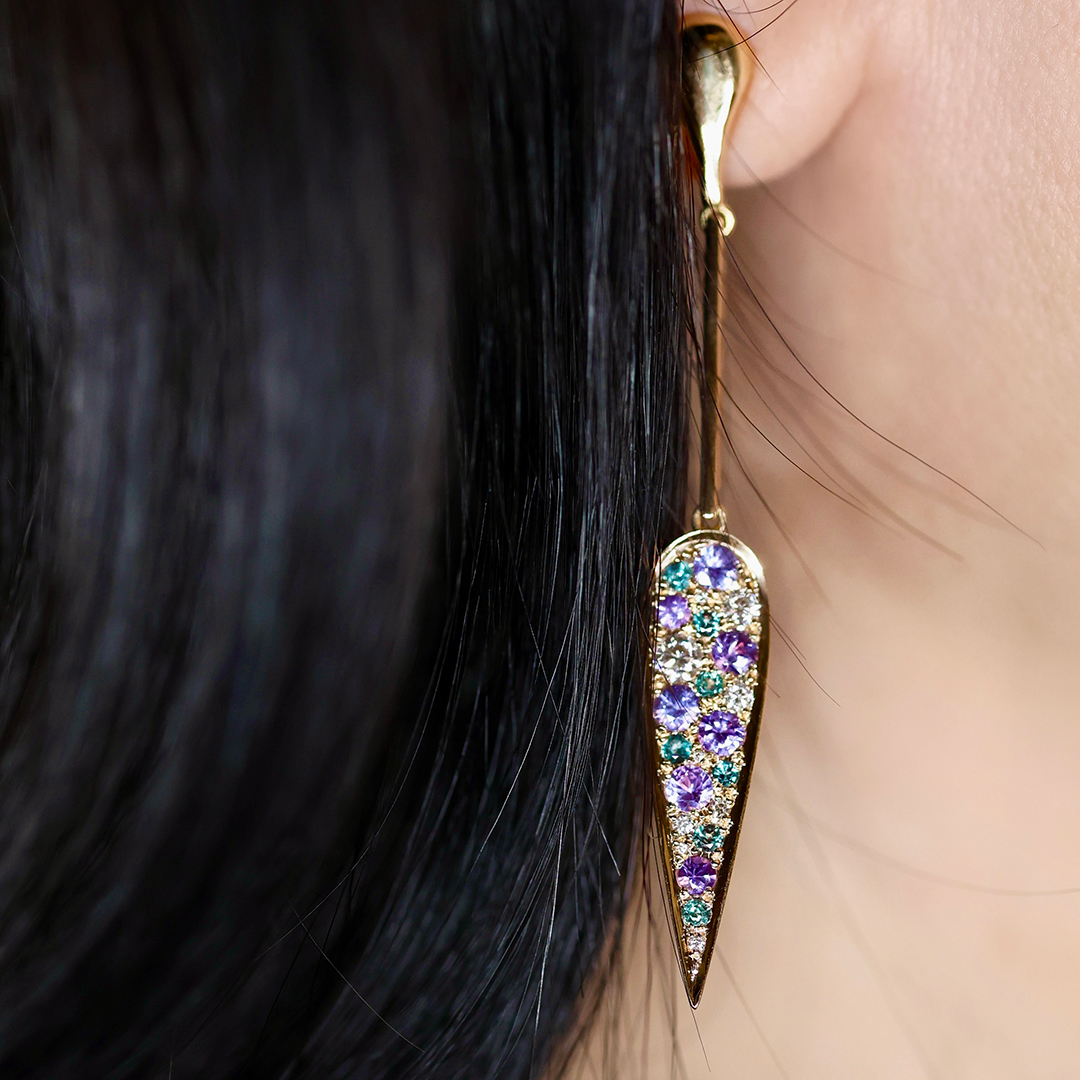 Part of the Starstruck collection, their elongated drop silhouette moves freely and catches the light, while the pavé composition blends colour-changing alexandrites, purple sapphires and brilliant-cut natural diamonds into a vibrant, painterly gradient.