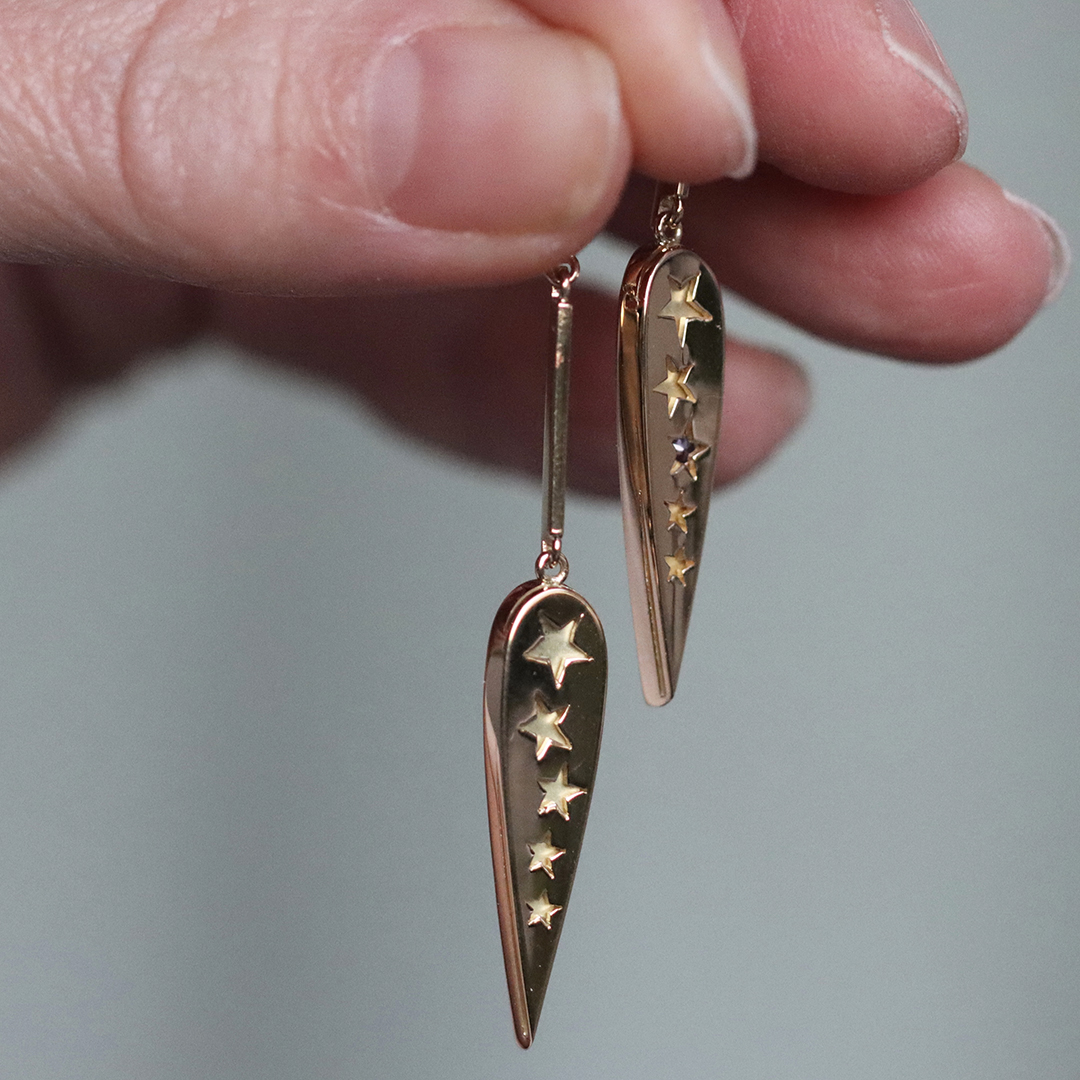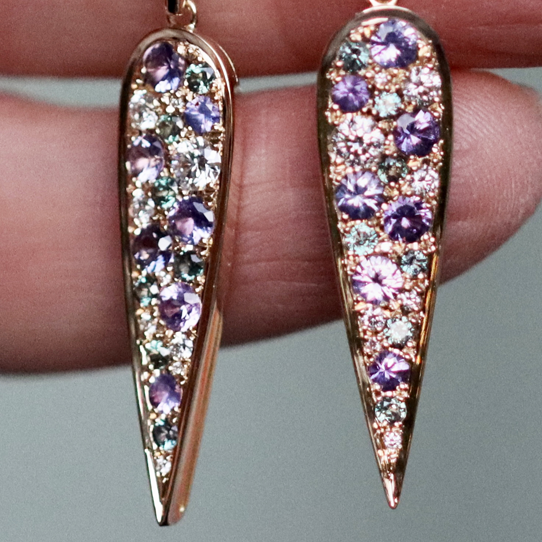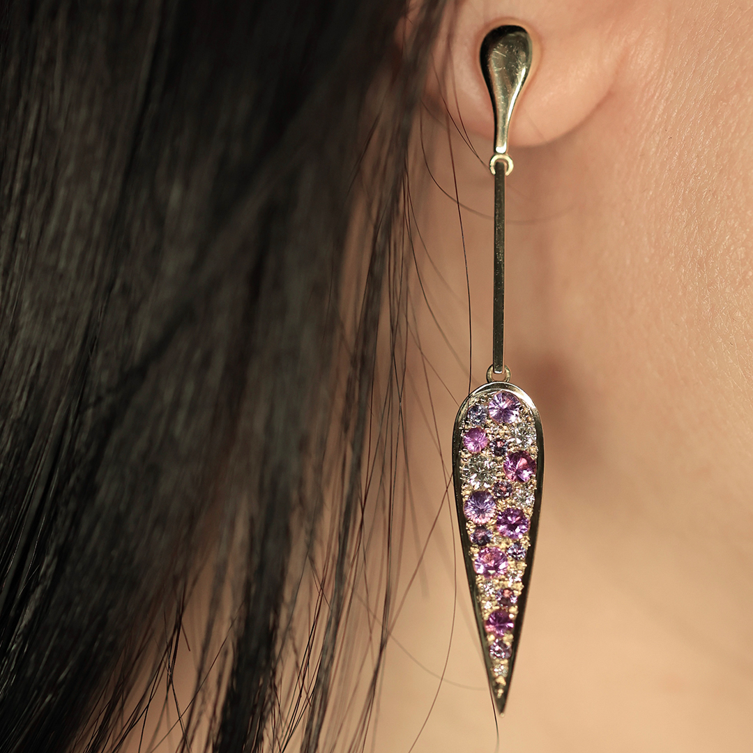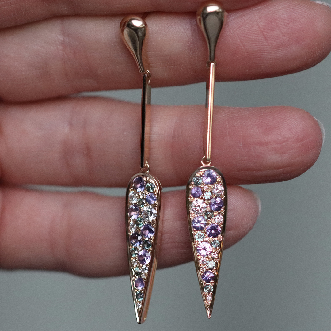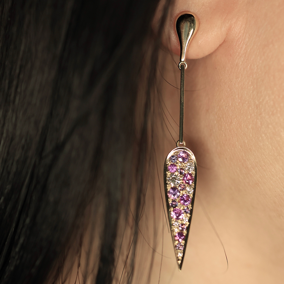 Part of the Starstruck collection, their elongated drop silhouette moves freely and catches the light, while the pavé composition blends colour-changing alexandrites, purple sapphires and brilliant-cut natural diamonds into a vibrant, painterly gradient.