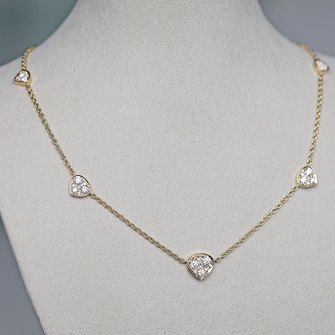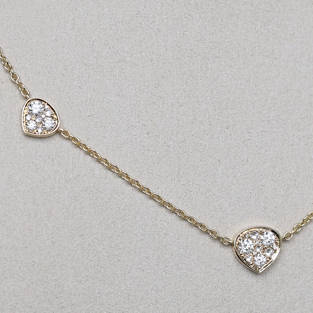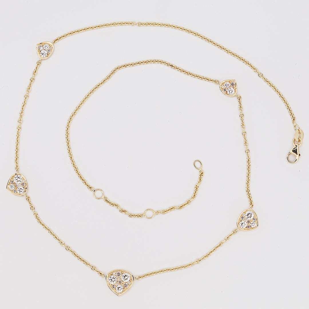 This elegant 18K yellow gold necklace features five delicate triangular motifs, each pavé-set with natural brilliant-cut diamonds.