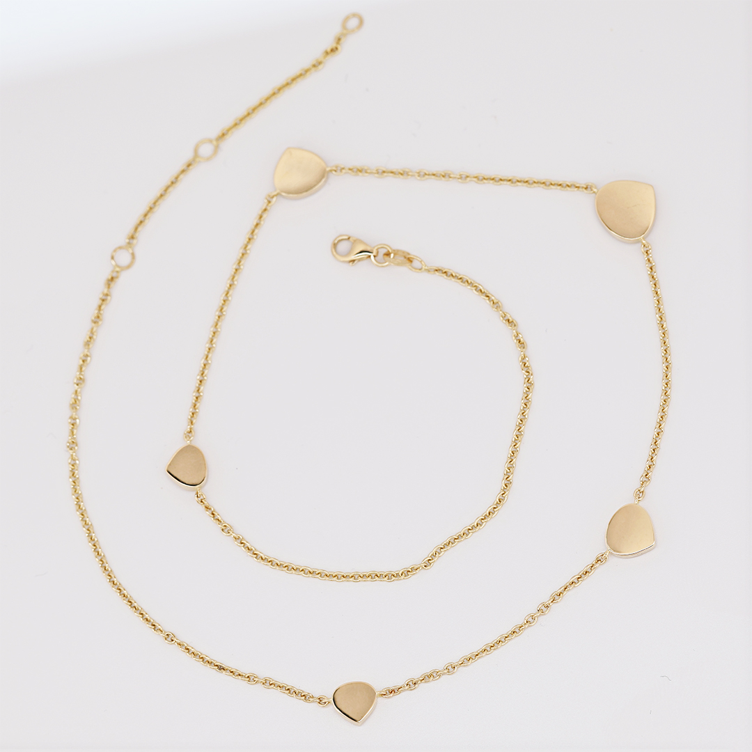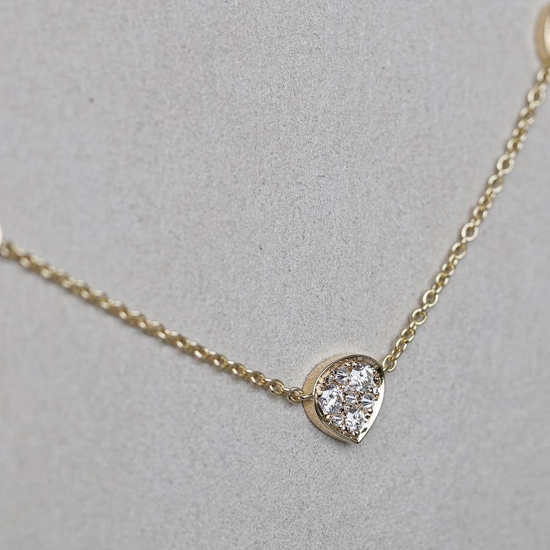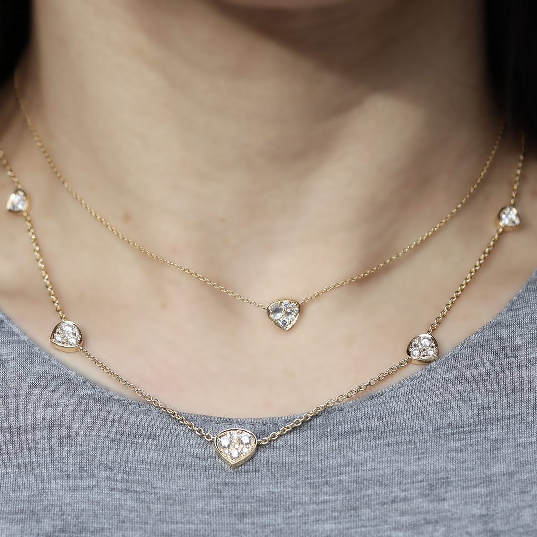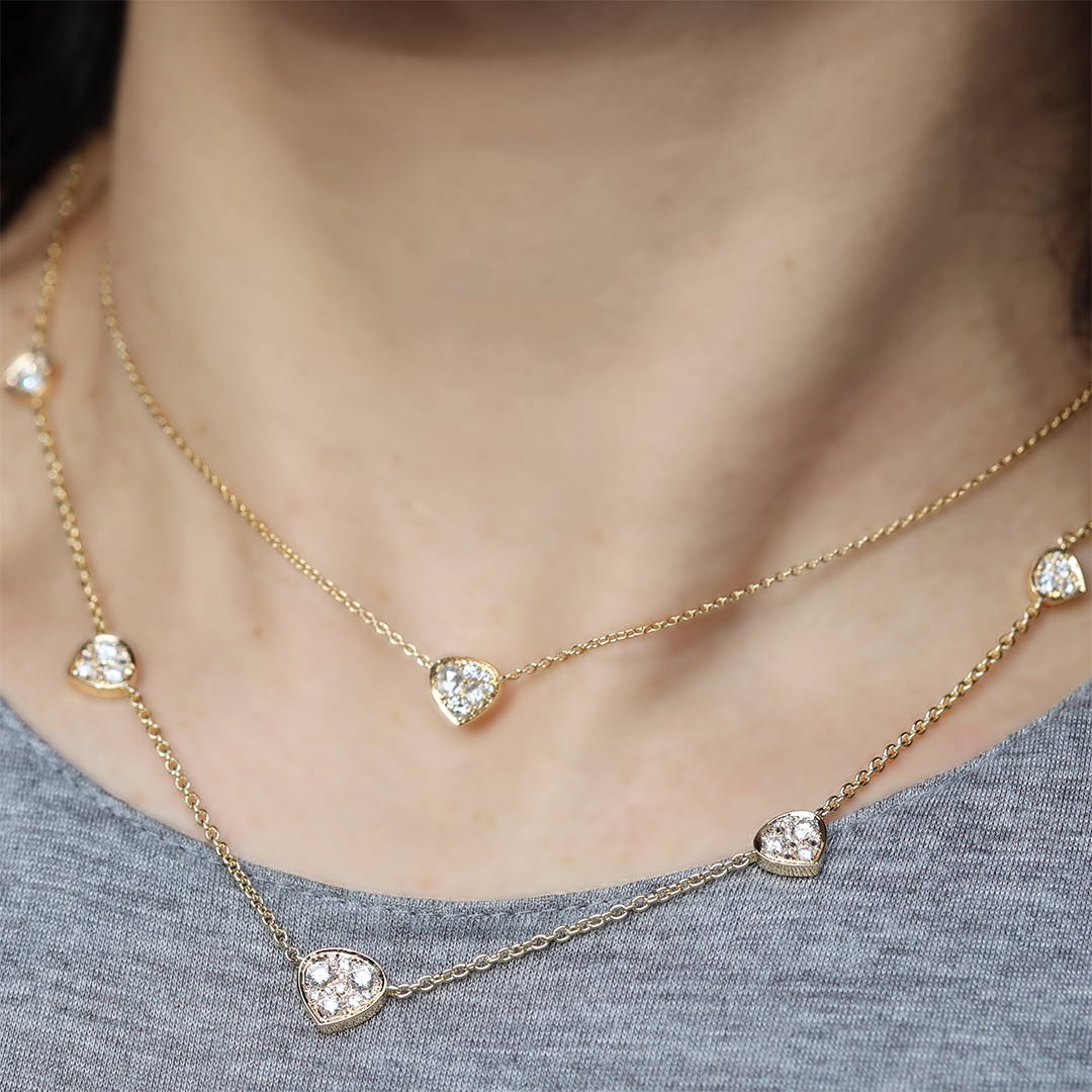 The orientation of the central motif is designed to subtly follow the natural lines of the neckline. The gentle triangular silhouette draws the eye downward, beautifully accentuating the décolleté while maintaining a light and balanced appearance.