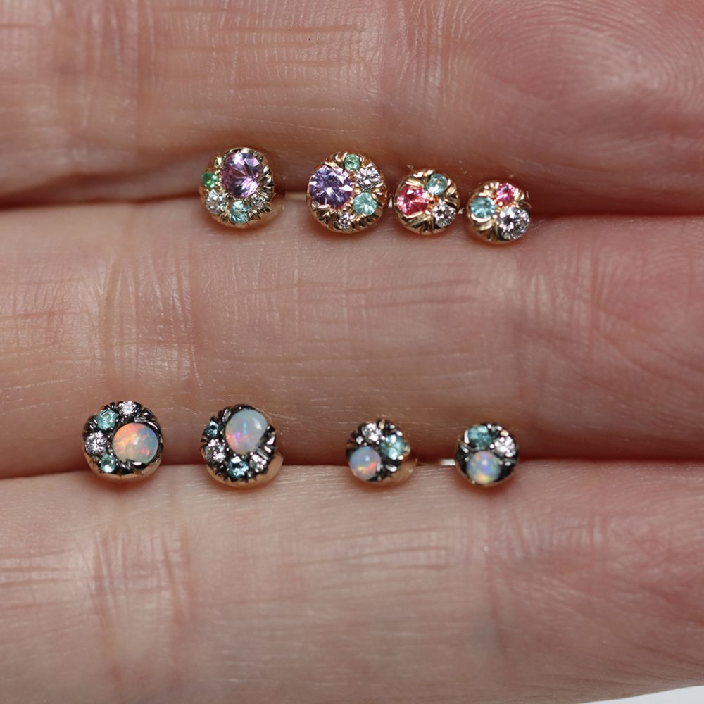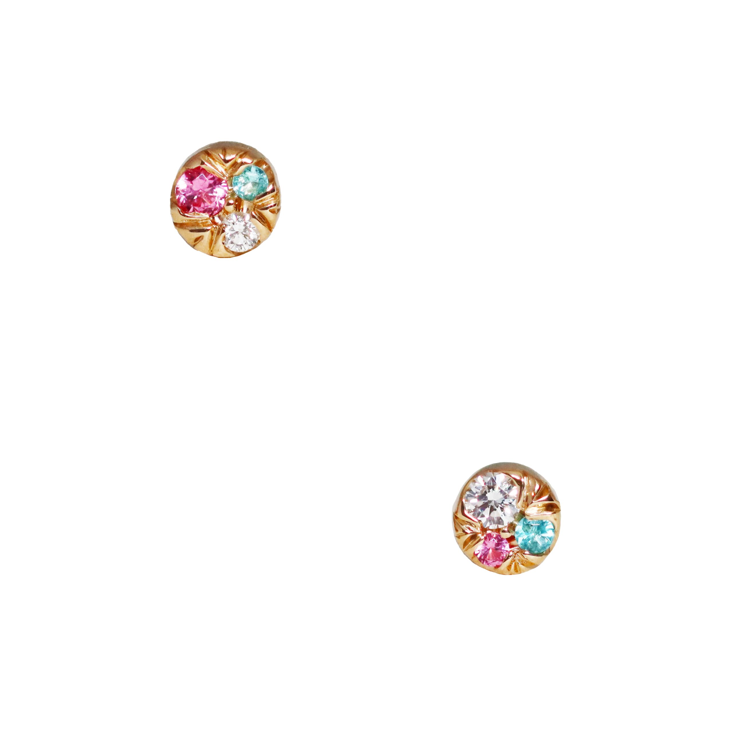 Designed as a subtly mismatched pair, each earring features its own distinctive arrangement of gemstones, creating a harmonious asymmetry.