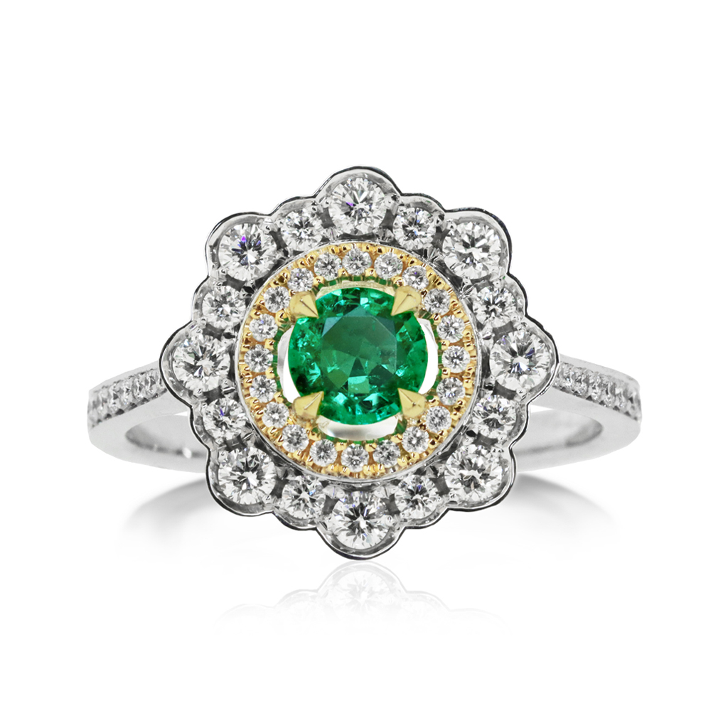 The inner halo and prongs are crafted in yellow gold to enhance the emerald’s natural depth of colour, while the outer white gold halo adds brilliance and contrast.