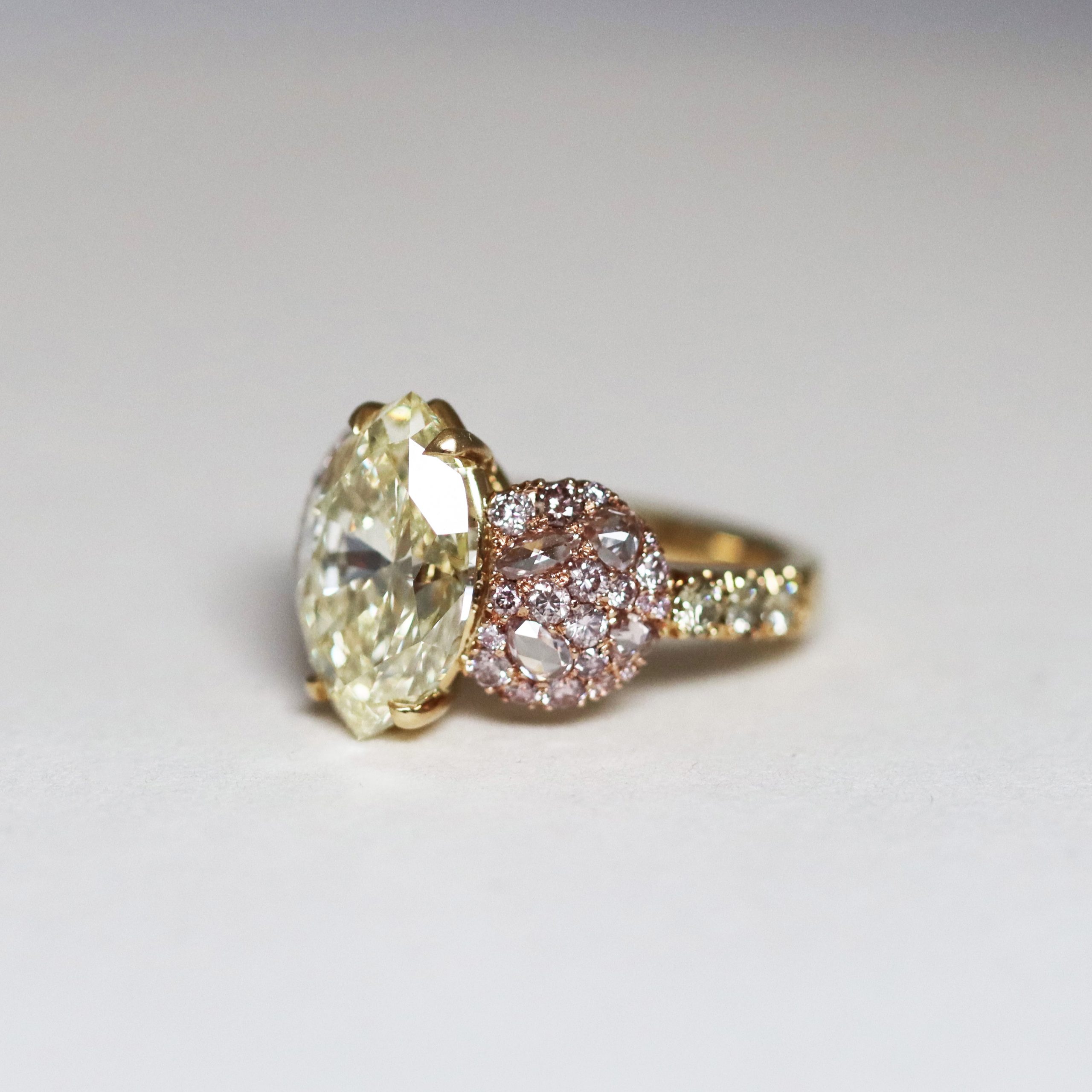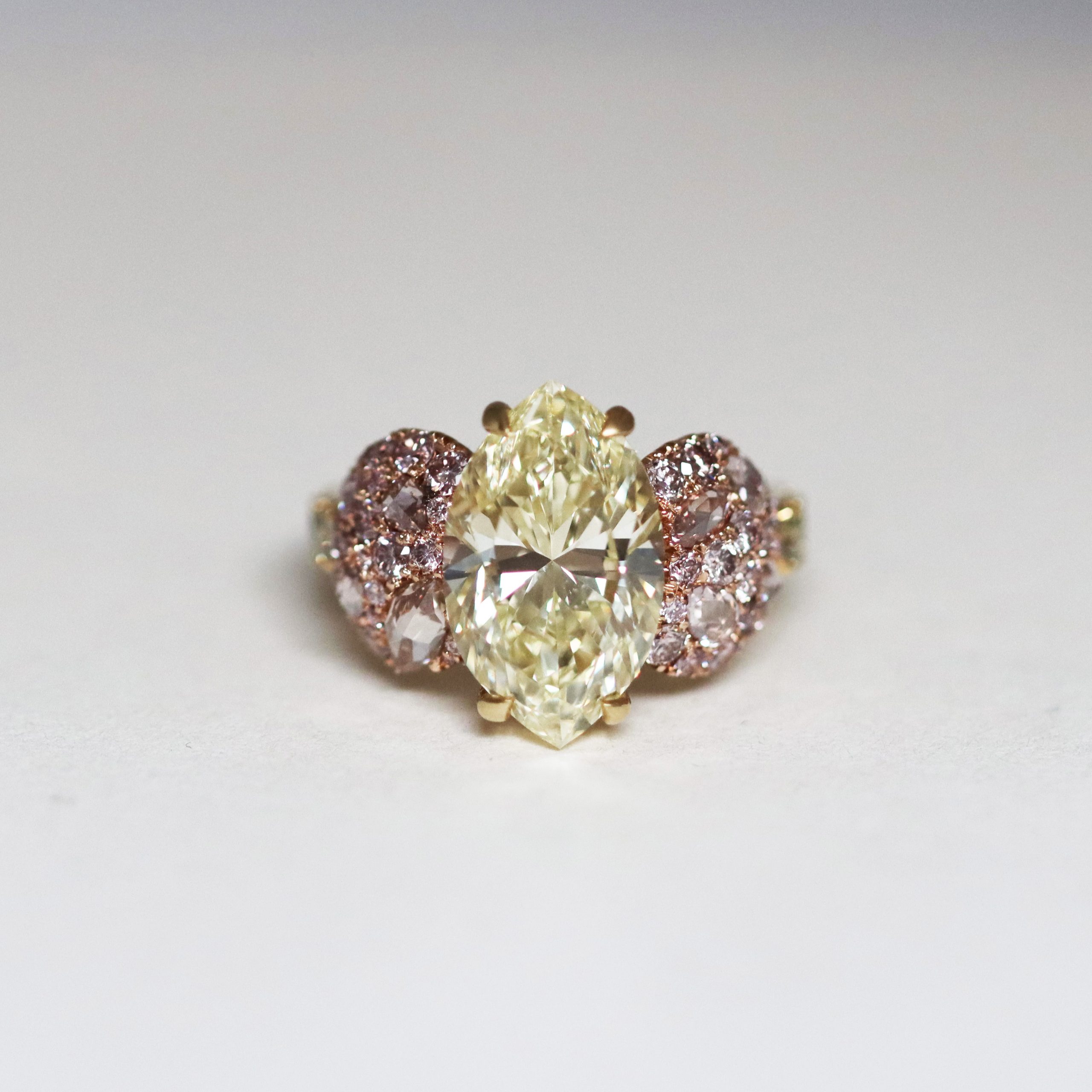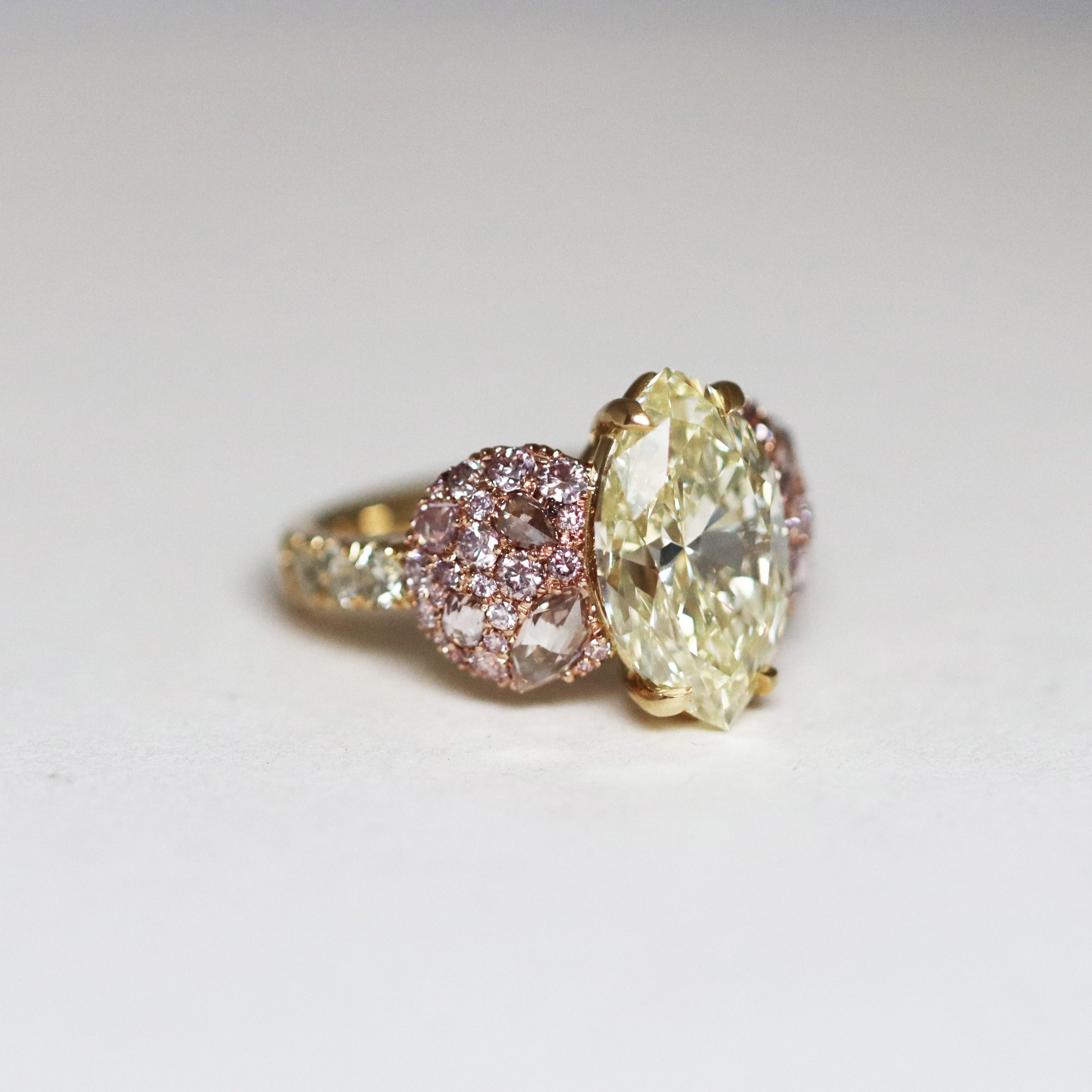 Introducing a one-of-a-kind ring in 18K Yellow & Rose gold with a stunning GIA Certified Fancy Light Yellow 6.02 ct. Marquise shape diamond centerstone. The centerstone is surrounded by a beautiful array of pave set Fancy Pink brilliant-cut diamonds, Fancy Pink rose-cut diamonds, and Fancy Green brilliant-cut diamonds, creating a harmonious color palette that is both striking and understated.
