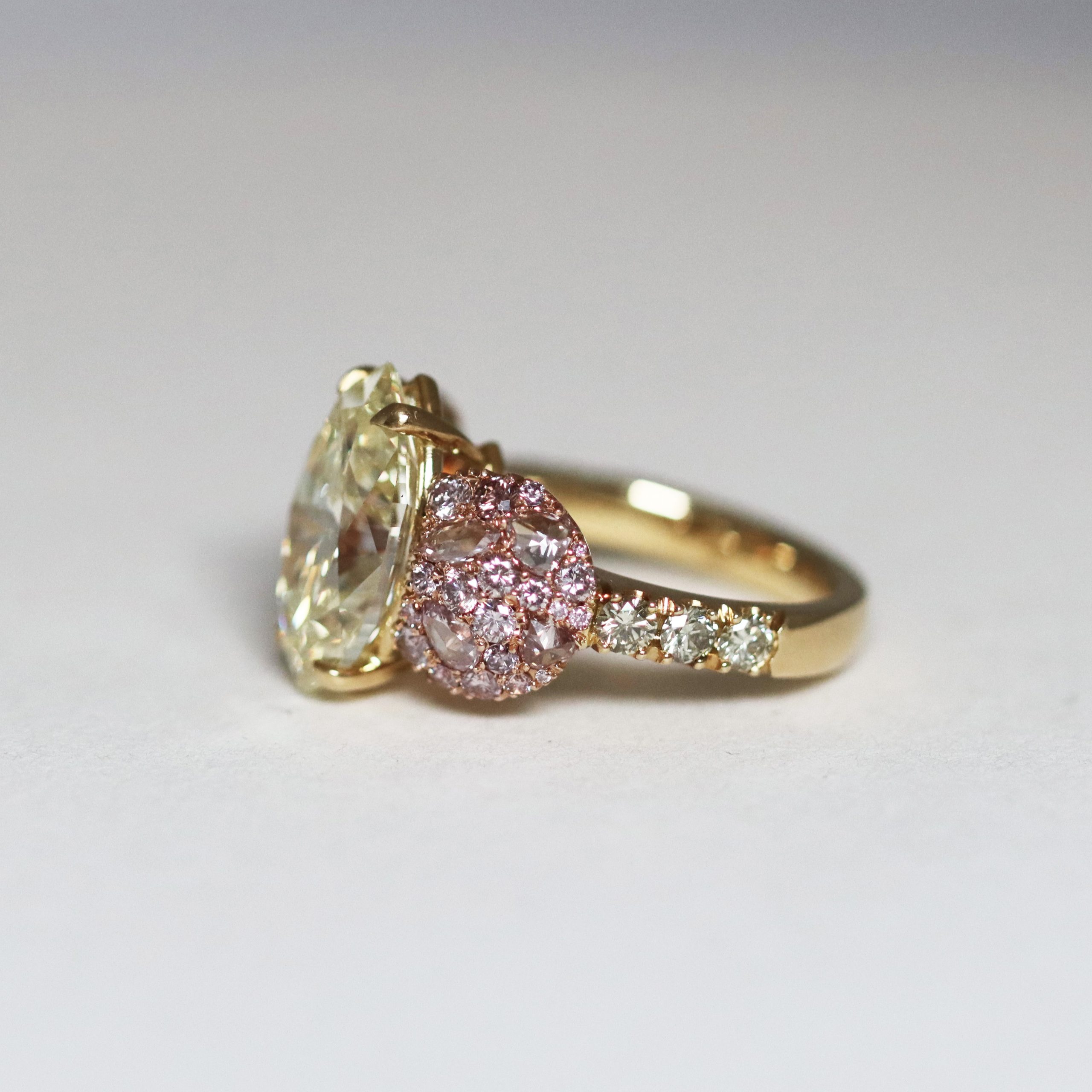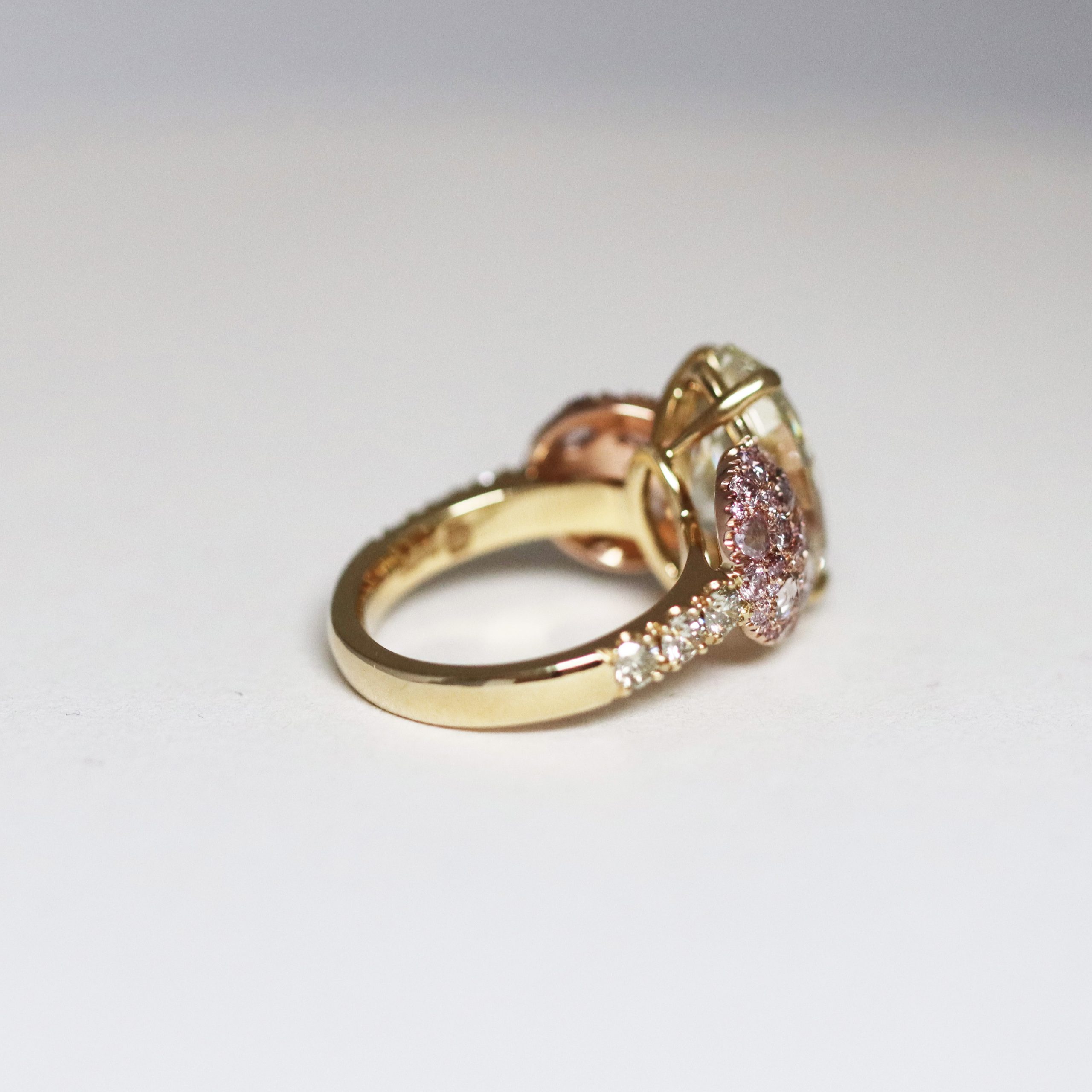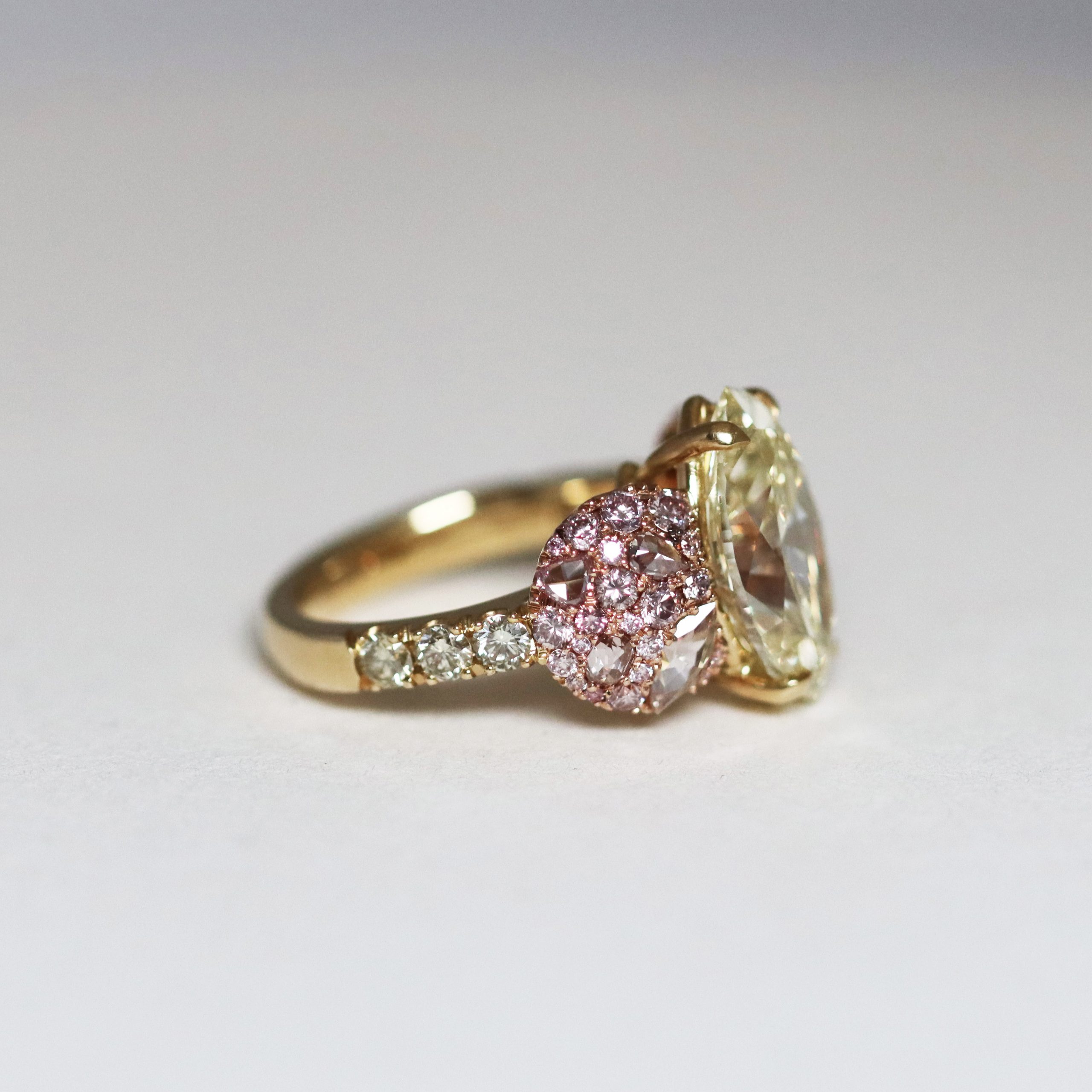 Introducing a one-of-a-kind ring in 18K Yellow & Rose gold with a stunning GIA Certified Fancy Light Yellow 6.02 ct. Marquise shape diamond centerstone. The centerstone is surrounded by a beautiful array of pave set Fancy Pink brilliant-cut diamonds, Fancy Pink rose-cut diamonds, and Fancy Green brilliant-cut diamonds, creating a harmonious color palette that is both striking and understated.