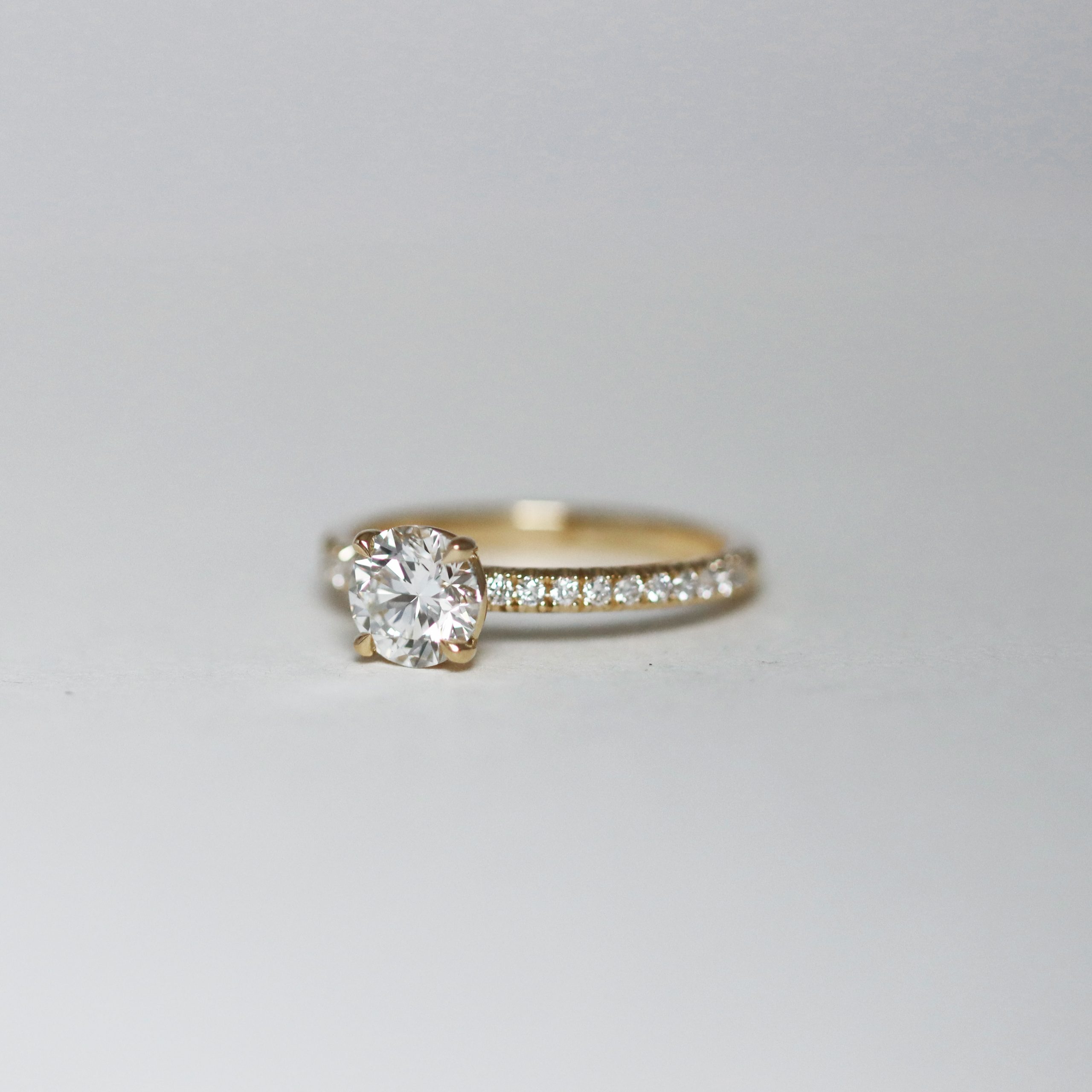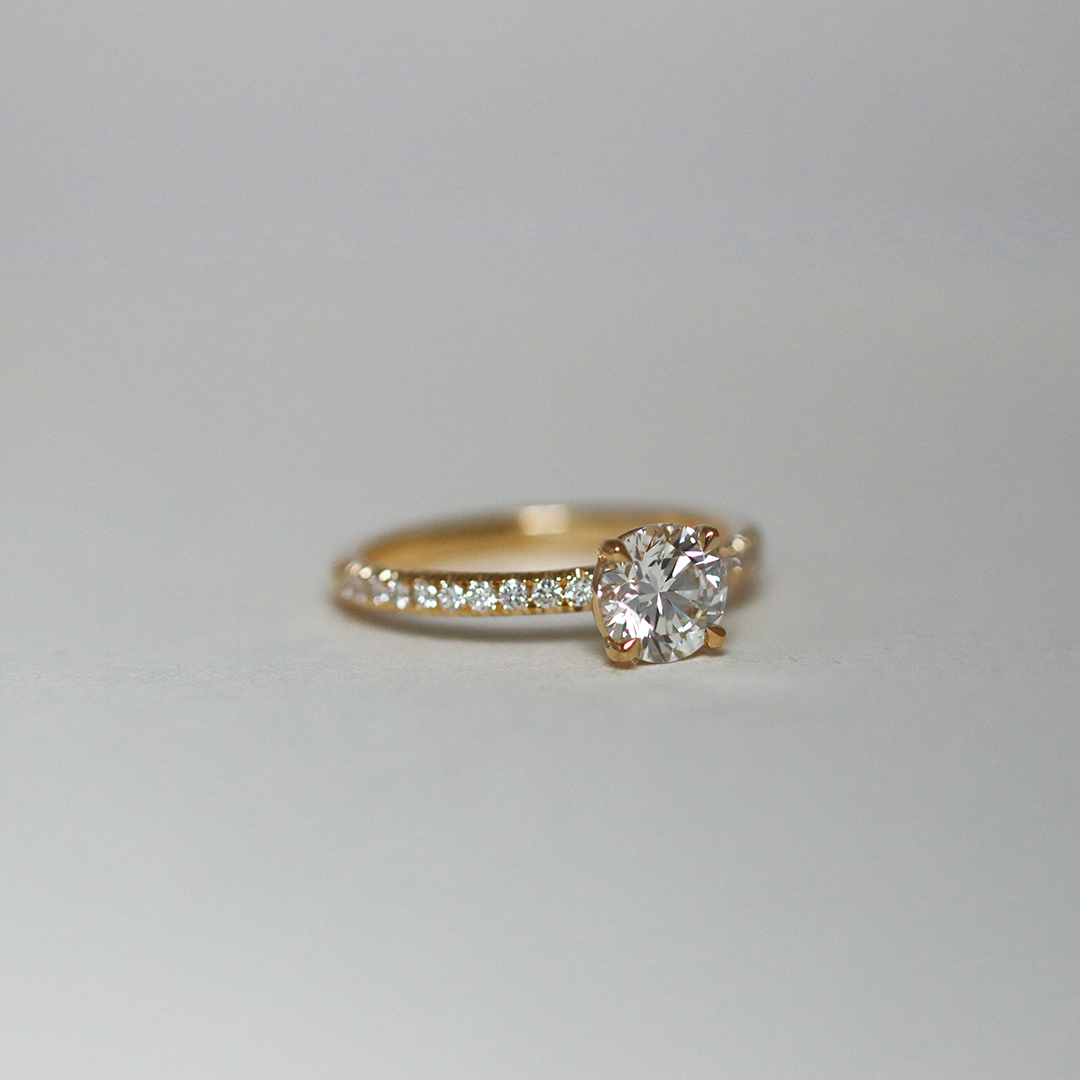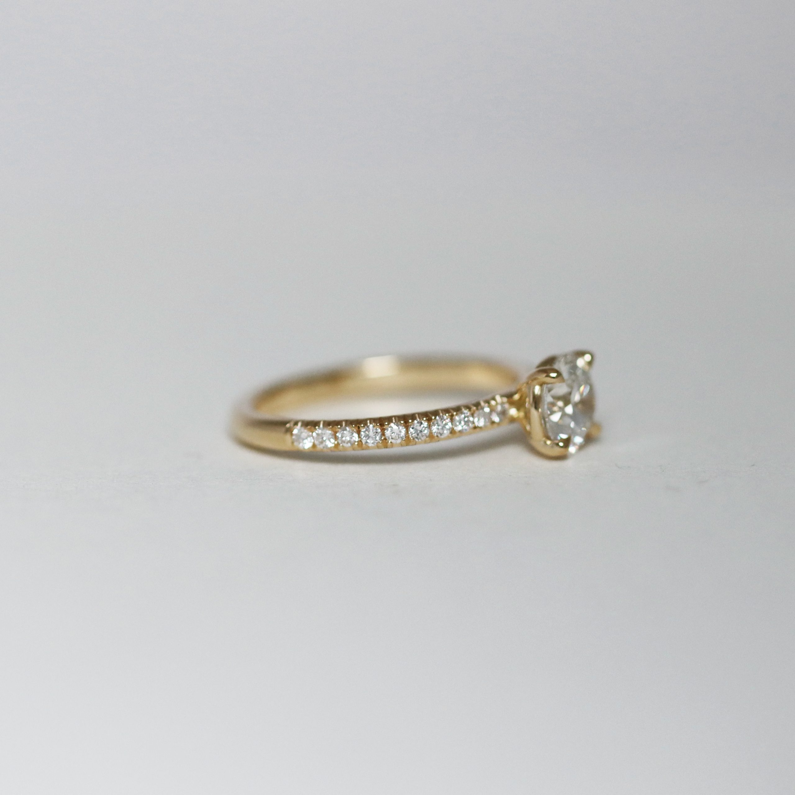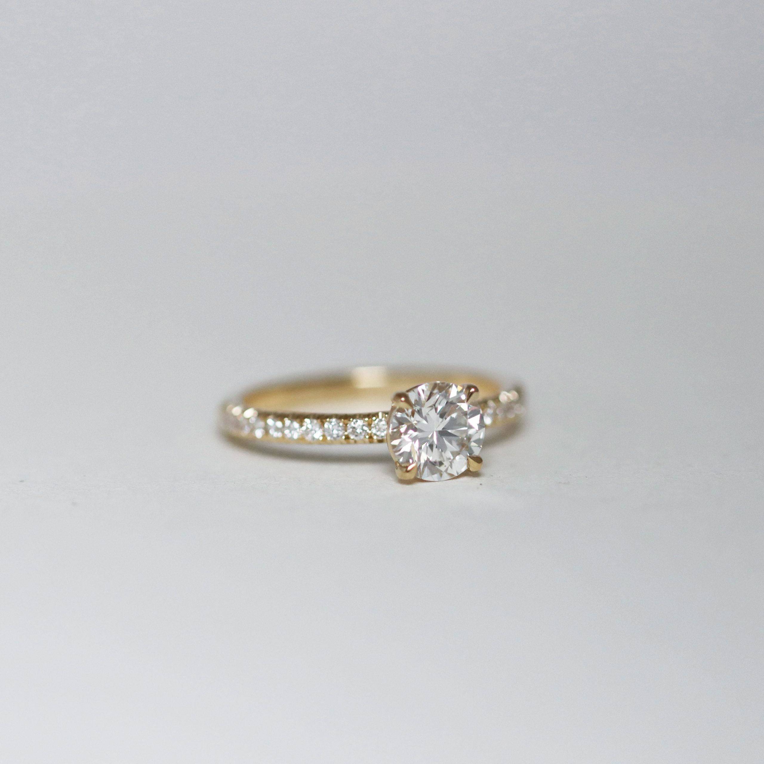 The combination of warm yellow gold and the crisp brilliance of lab-grown diamonds gives this ring a modern yet enduring elegance, perfect as an engagement ring or a signature everyday piece.