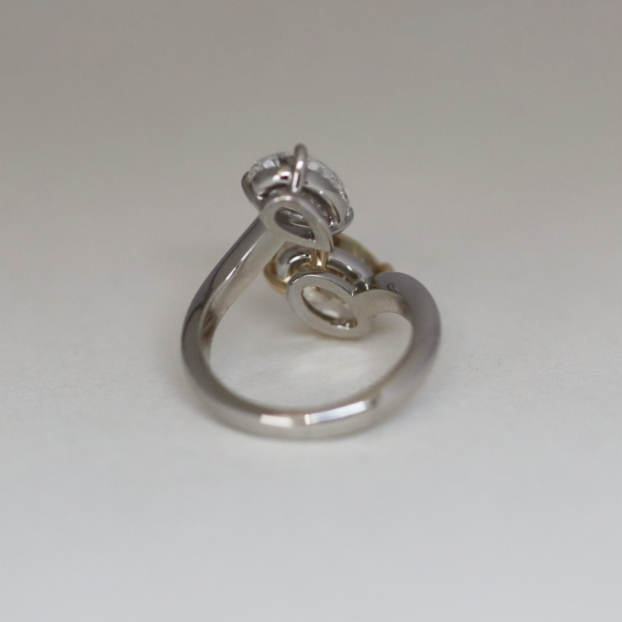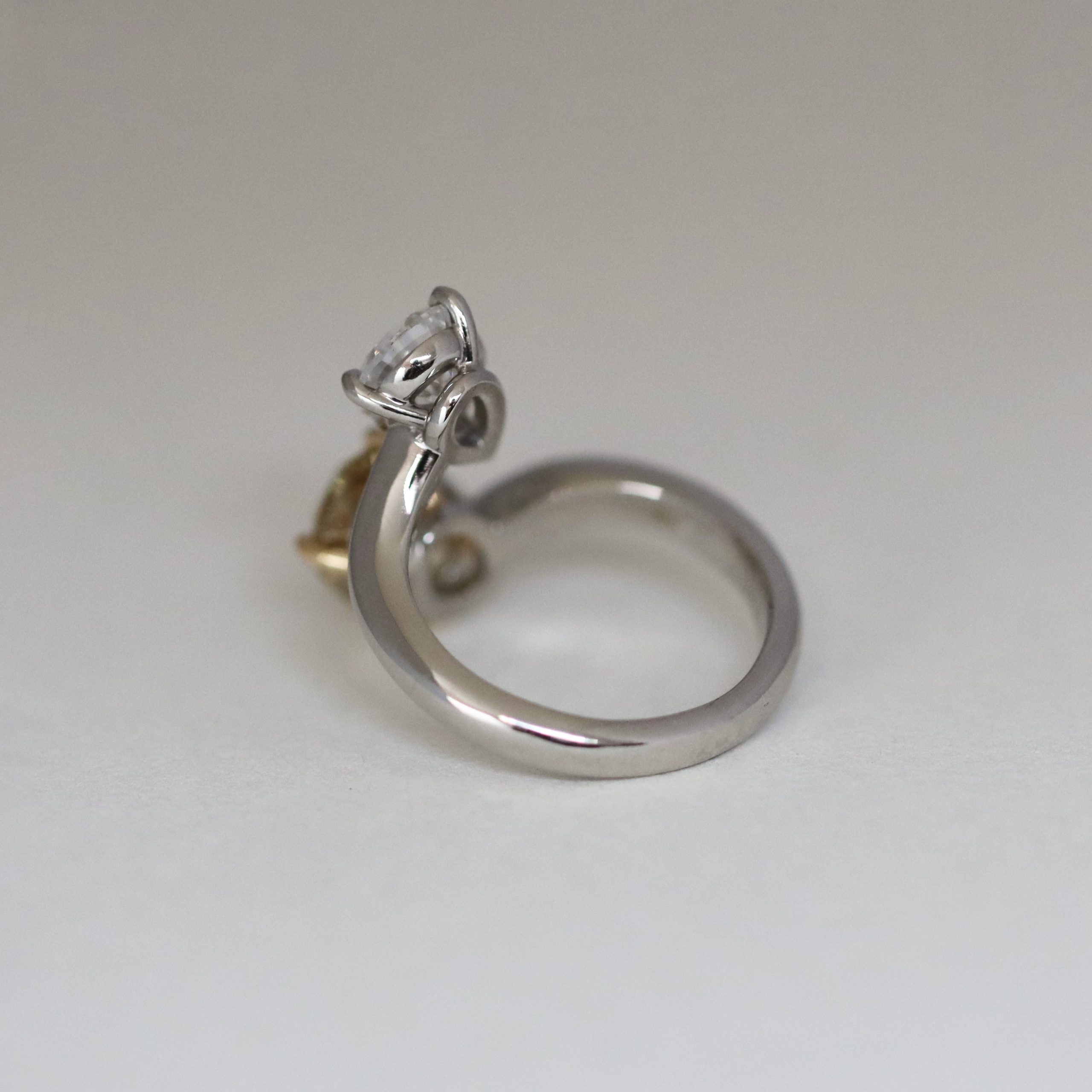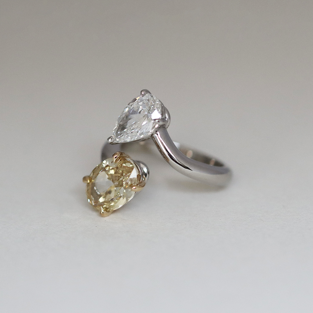 The contrasting tones and shapes create a refined balance between light and warmth, united by a softly curved platinum band.