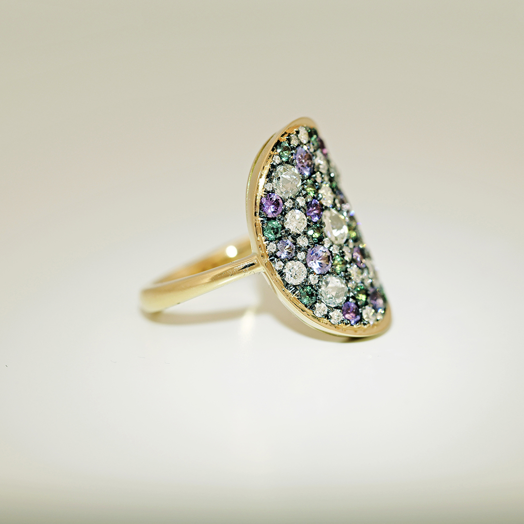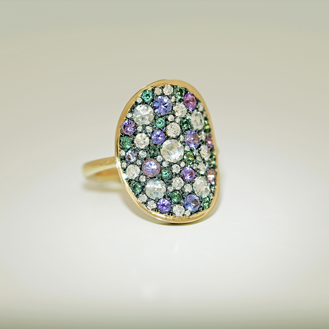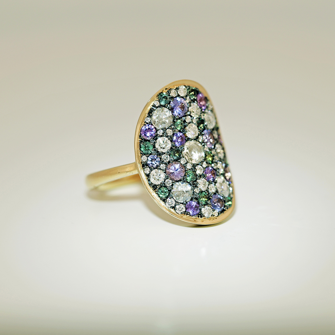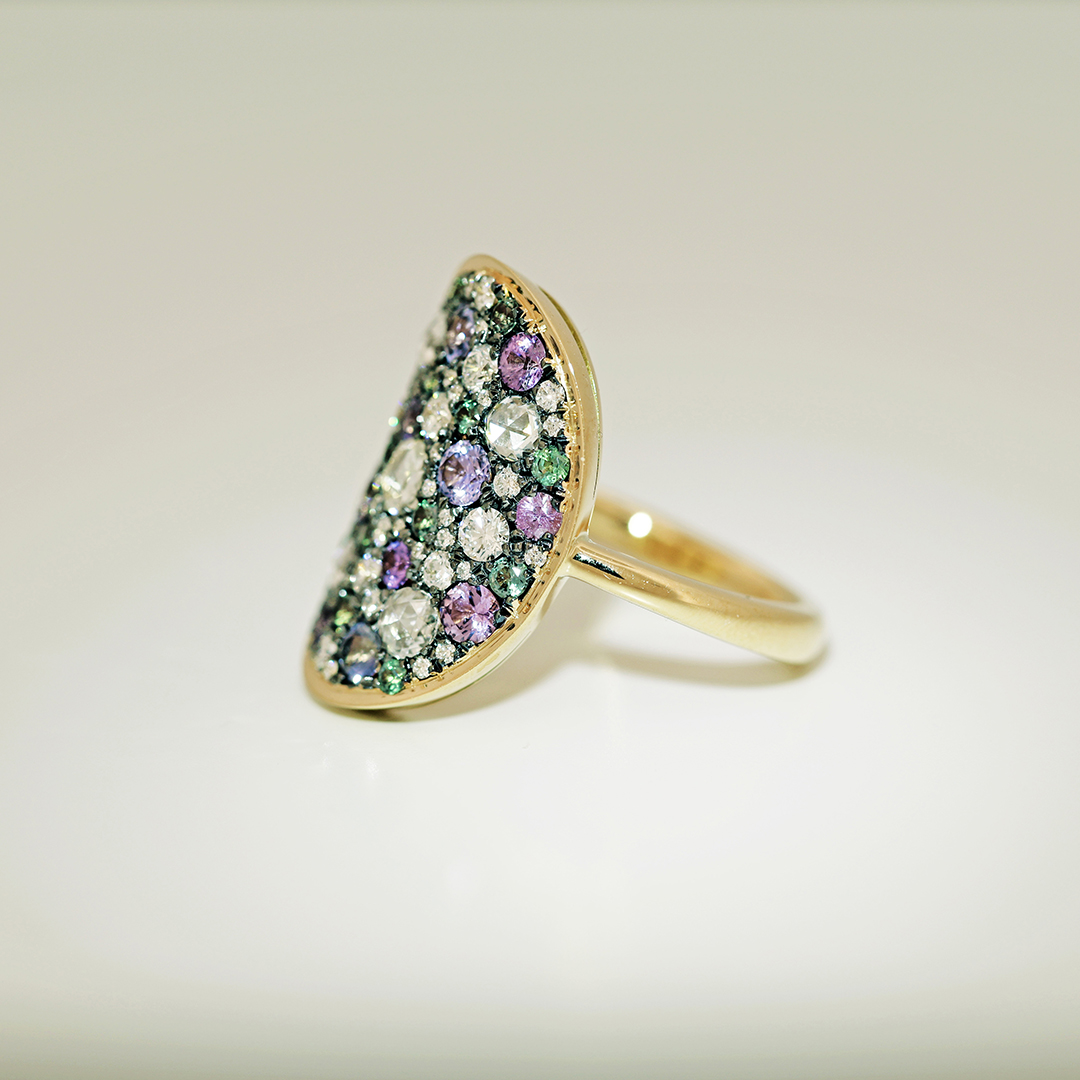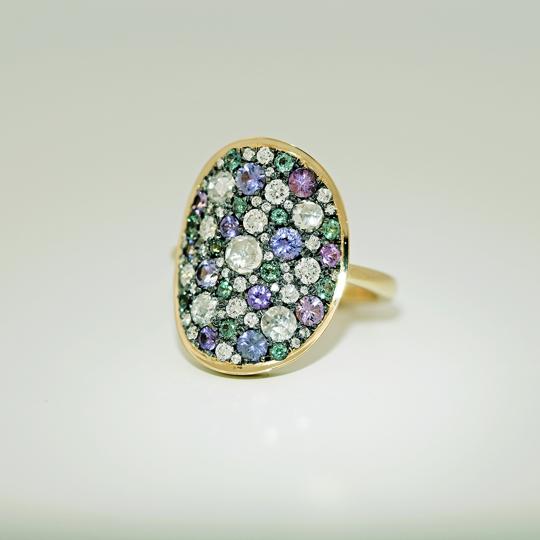The setting of these stones on a black rhodiumplated yellow gold base creates a contrasting dark background, enhancing the colors of each gemstone.