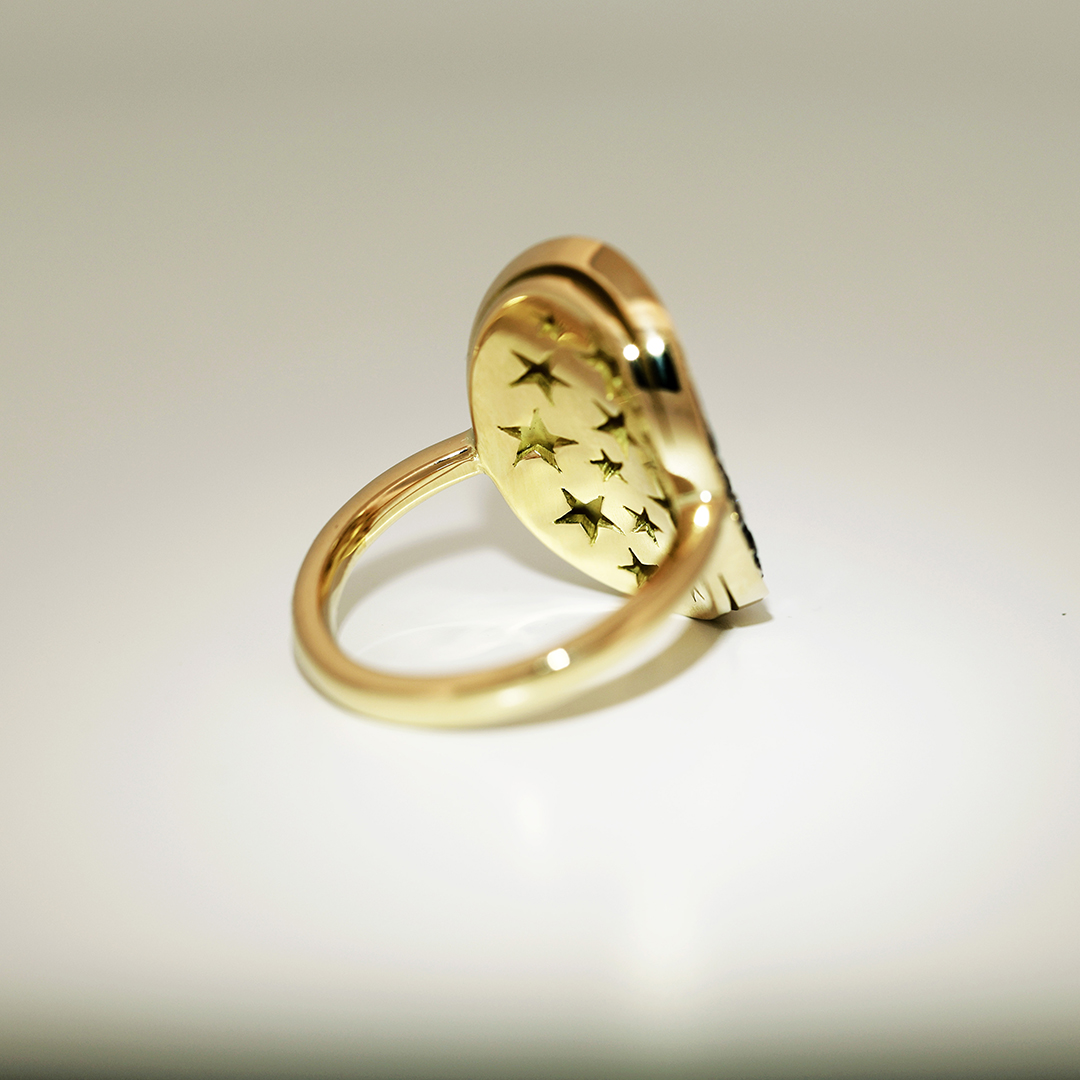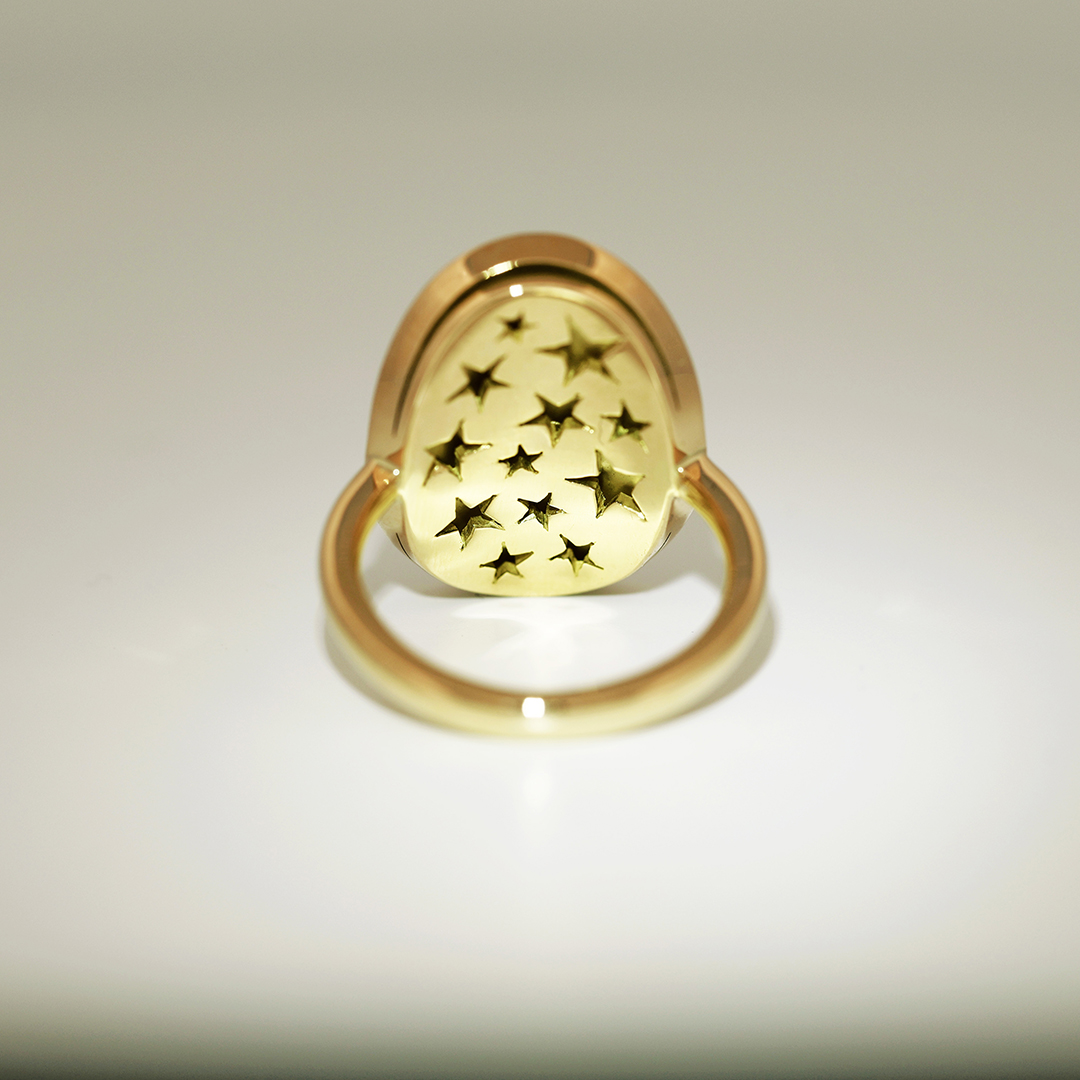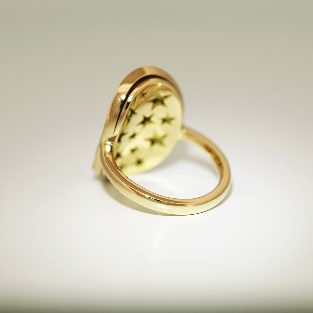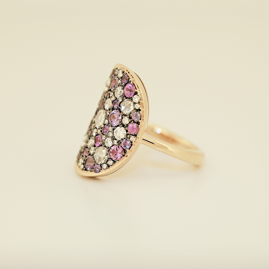 This piece by Joke Quick is handcrafted in Belgium, without casting or 3D printing. Our signature mosaic setting ensures a seamless sparkle that won’t snag on clothes.