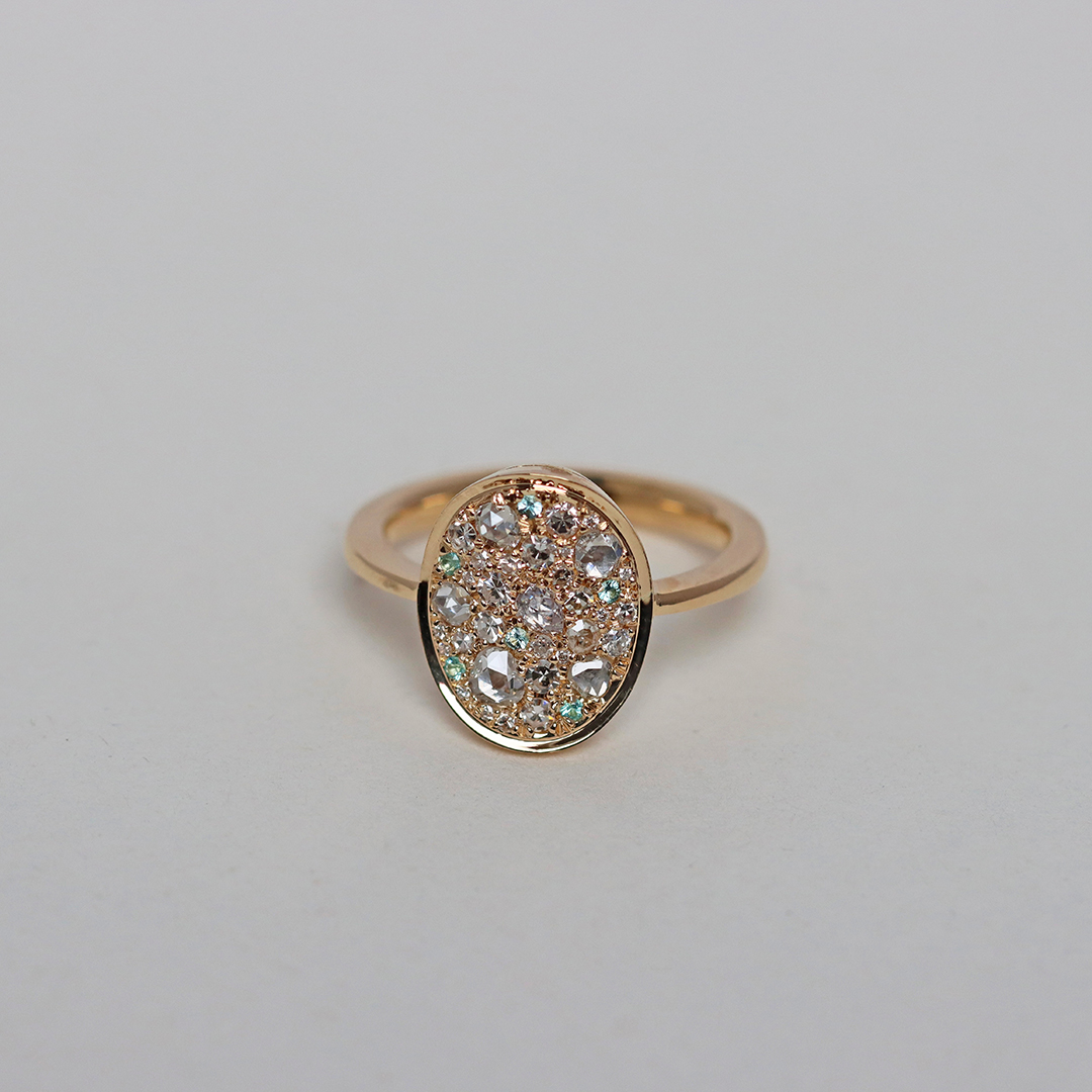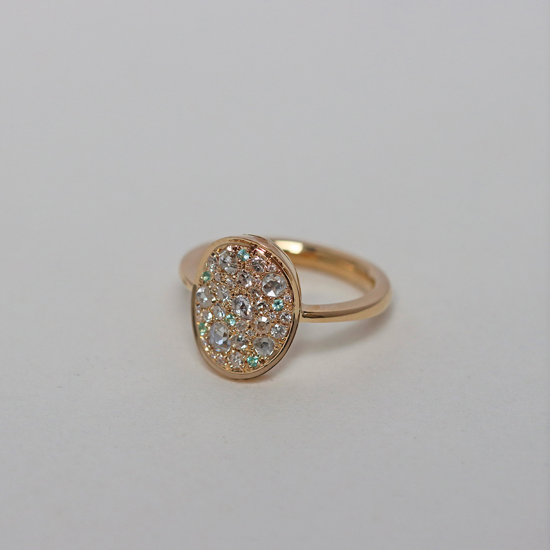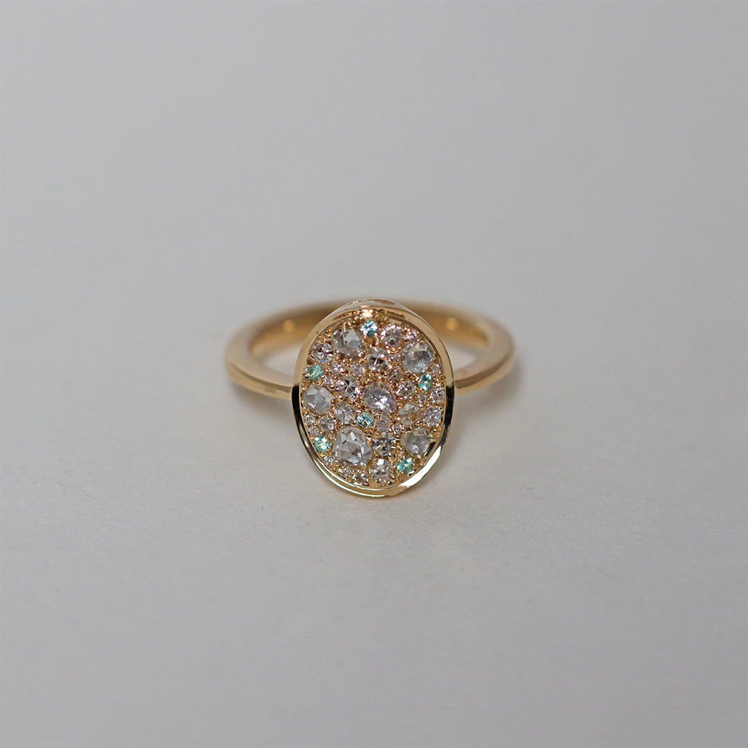 One of a kind Mosaic Pave Ring, handmade in Belgium with no casting or printing involved. Patiently set with rare Paraiba Tourmalines , Antique Rose-Cut Diamonds, Octagon-Cut diamonds and brilliant-cut diamonds.