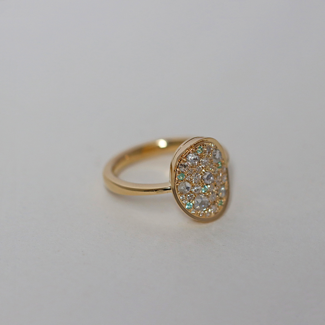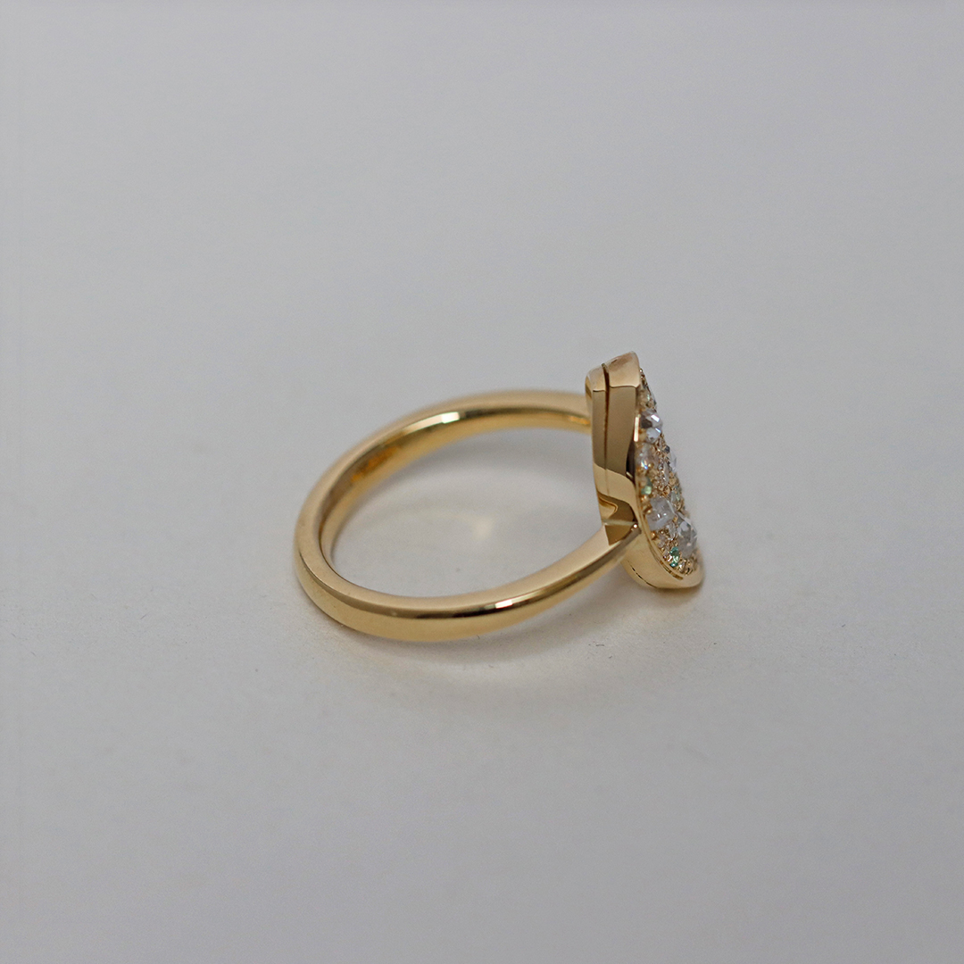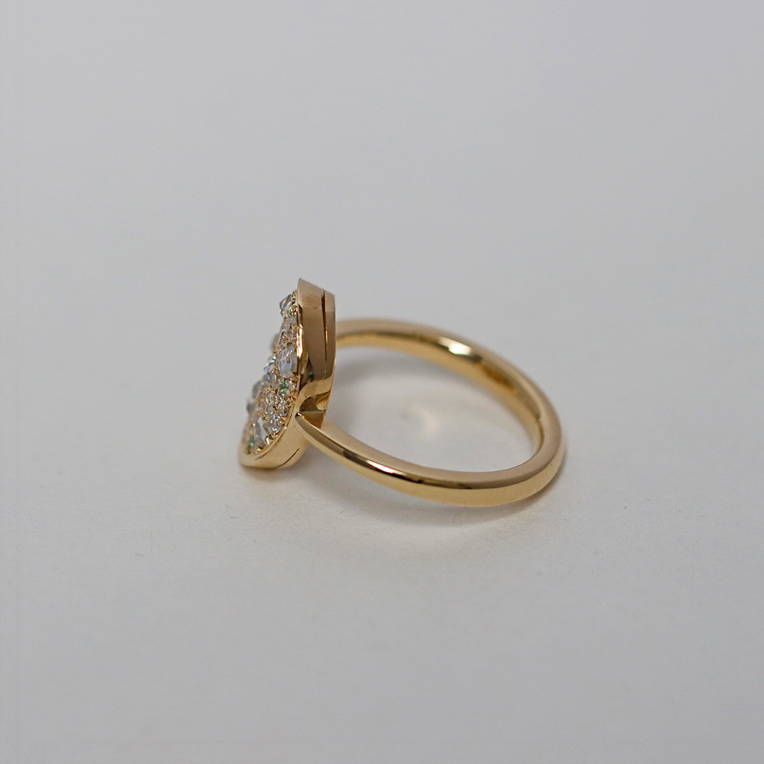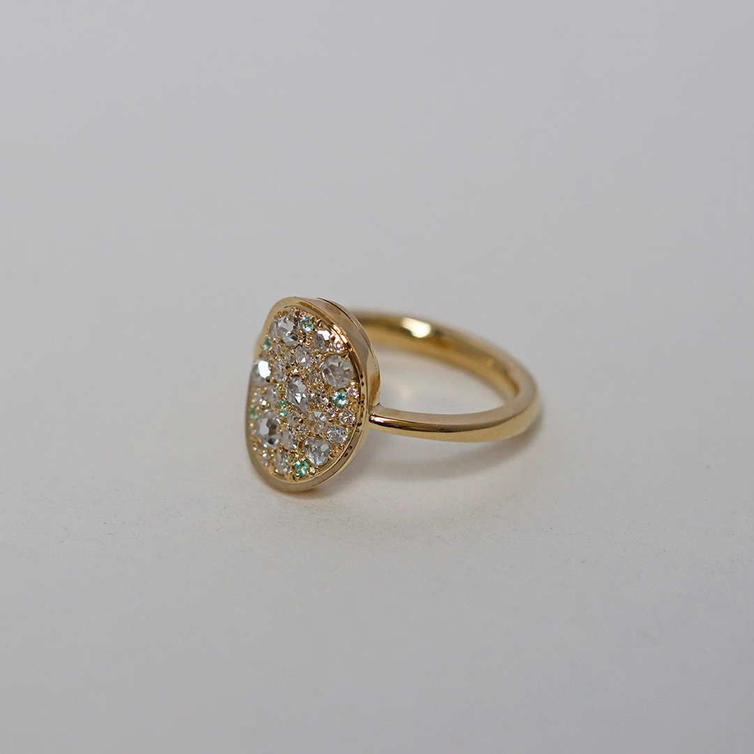 One of a kind Mosaic Pave Ring, handmade in Belgium with no casting or printing involved. Patiently set with rare Paraiba Tourmalines , Antique Rose-Cut Diamonds, Octagon-Cut diamonds and brilliant-cut diamonds.